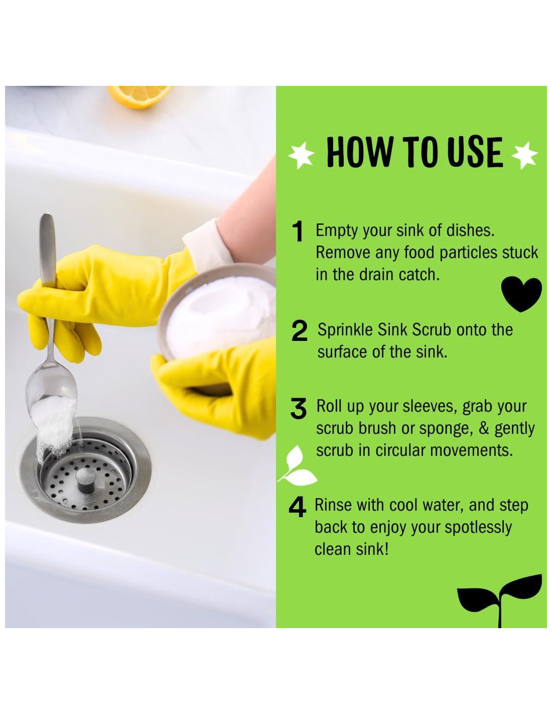 - CÓMO USAR: Espolvorea el fregado para fregadero sobre tu fregadero, bañera, inodoro o superficie. Frota suavemente con una esponja o cepillo. Enjuaga con agua.
