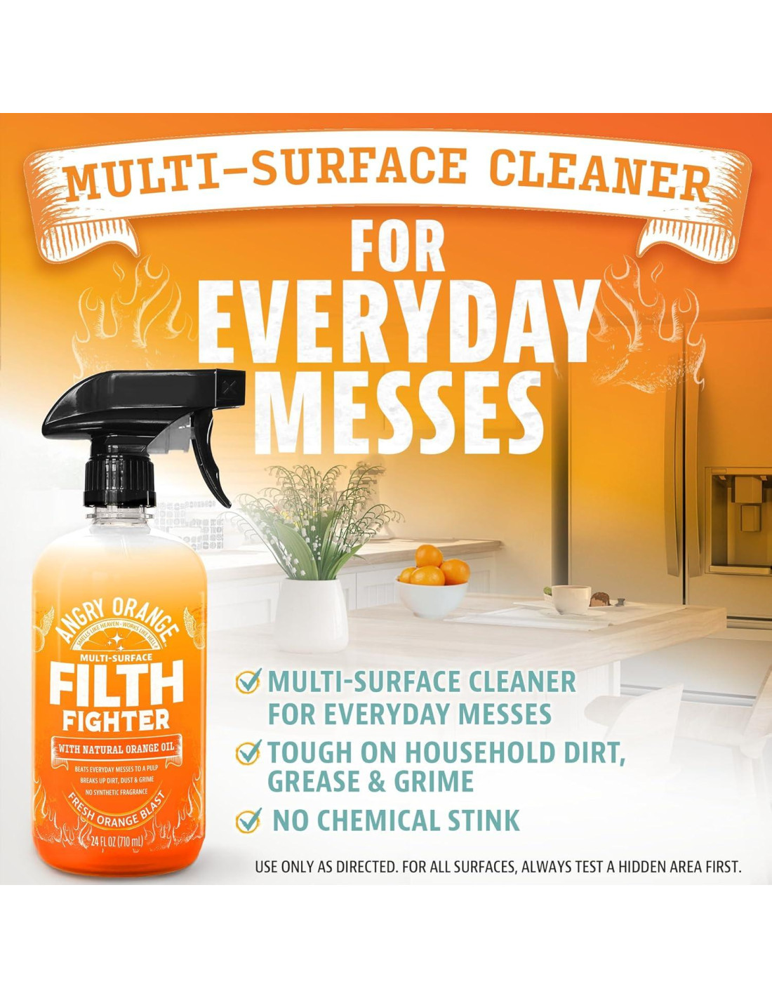 Limpia la suciedad y mugre de tu mascota. Desata el aroma celestial de cítricos y detén los desastres en seco con productos hechos para los olores y manchas más desagradables de las mascotas. Elimina el mal olor de las mascotas y controla las manchas con un olor fresco y limpio que funciona de maravilla. Limpia en cualquier lugar de la casa con el poder de estos dúos. Usa los productos Angry Orange juntos para un golpe de 1-2. Combate la suciedad y mugre con nuestros increíbles productos de limpieza multiusos. El Combatiente de Suciedad Multi-Superficie Angry Orange tiene un aroma fresco y celestial impulsado por aceite de naranja natural de cáscaras de naranja prensadas en frío. Por eso este limpiador multiusos de alta resistencia no tiene olor químico ni aroma a perfume cuando lo rocías. Combate la suciedad sin una larga lista de ingredientes. Nuestro limpiador multi-superficie no está formulado con parabenos ni ftalatos y tampoco contiene blanqueador ni amoníaco. Además, es seguro de usar en hogares con perros cuando se usa según las indicaciones. Angry Orange sabe cómo eliminar los desastres difíciles... tanto de humanos como de mascotas. Combate los desastres más sucios del hogar con nuestro Combatiente de Suciedad o enfrenta los olores y accidentes más desagradables de las mascotas con los productos Eliminador de Olores y Quitamanchas de Mascotas Angry Orange. Estamos decididos a hacer que tu hogar sea fresco y limpio.