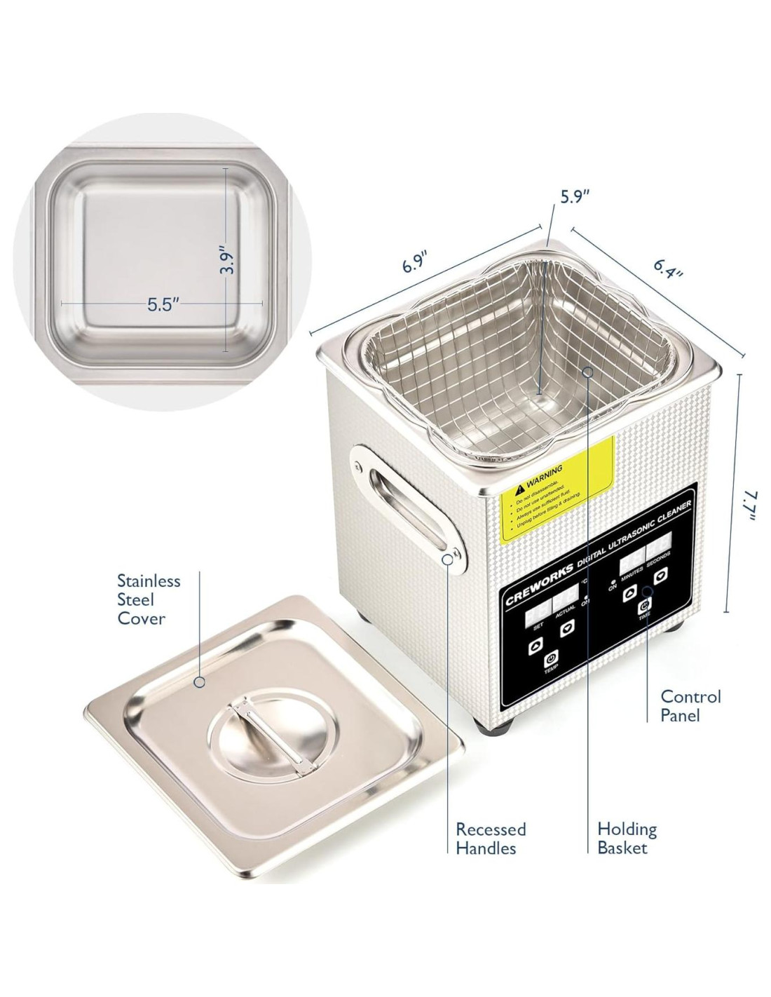 Creworks comenzó con un objetivo simple: ayudar a las personas de negocios en todo el espectro industrial a hacer el trabajo correctamente. Trabajamos en estrecha colaboración con los fabricantes para crear productos con un equilibrio excepcional de calidad genuina y asequibilidad. Creemos que las nuevas invenciones inspiradoras están ocultas en nuestra vida cotidiana. Por eso nos propusimos descubrir innovaciones únicas todos los días. Ponemos equipos de calidad profesional en tus manos para que puedas transformar tu hogar en un mundo que funcione para ti. Disfruta de años de uso confiable, silencioso y constante, gracias al recipiente de acero inoxidable 304 de una sola pieza, la tapa que suprime el ruido y los pies de goma a prueba de oscilaciones. Mueve fácilmente el limpiador a donde sea necesario con sus cómodas y convenientes asas integradas; y ten la seguridad de que tu artículo se mantiene alejado de las paredes dentro de la cesta de malla proporcionada. Deja que las ondas sonoras de 40kHz de este limpiador ultrasónico de 60W hagan todo el trabajo por ti, con la potente cavitación que limpia de manera segura incluso superficies delicadas e intrincadas, eliminando cualquier contaminante, deslustre o acumulación.