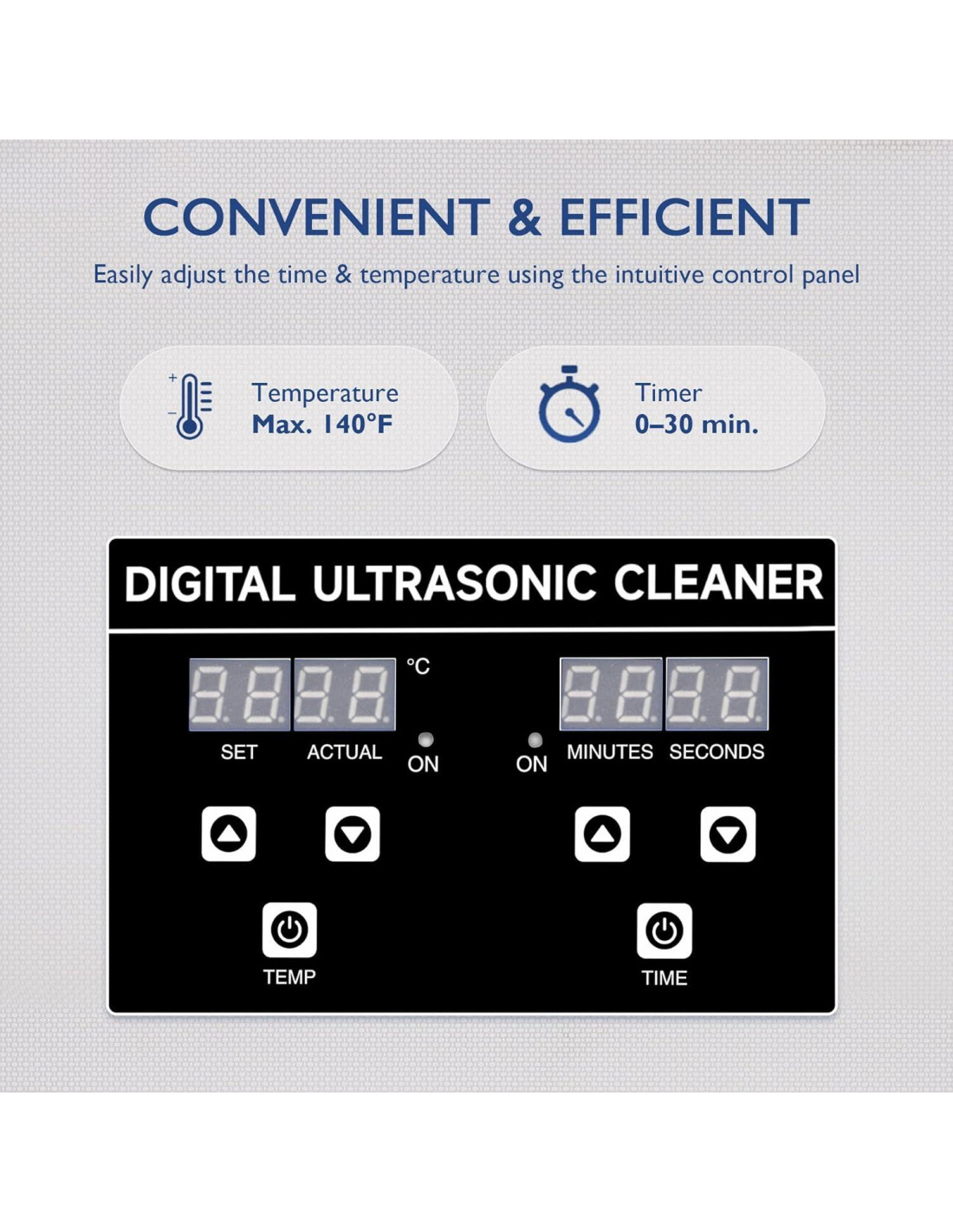 - FÁCIL COMO PUEDE SER: Tu objeto estará limpio en minutos. Llena el tanque con agua y cualquier limpiador necesario, coloca tus artículos en la cesta, ajusta la temperatura entre 20 y 80C (68 y 176F) y el temporizador de 1 a 30 minutos en el panel de control digital intuitivo, y presiona el botón de encendido