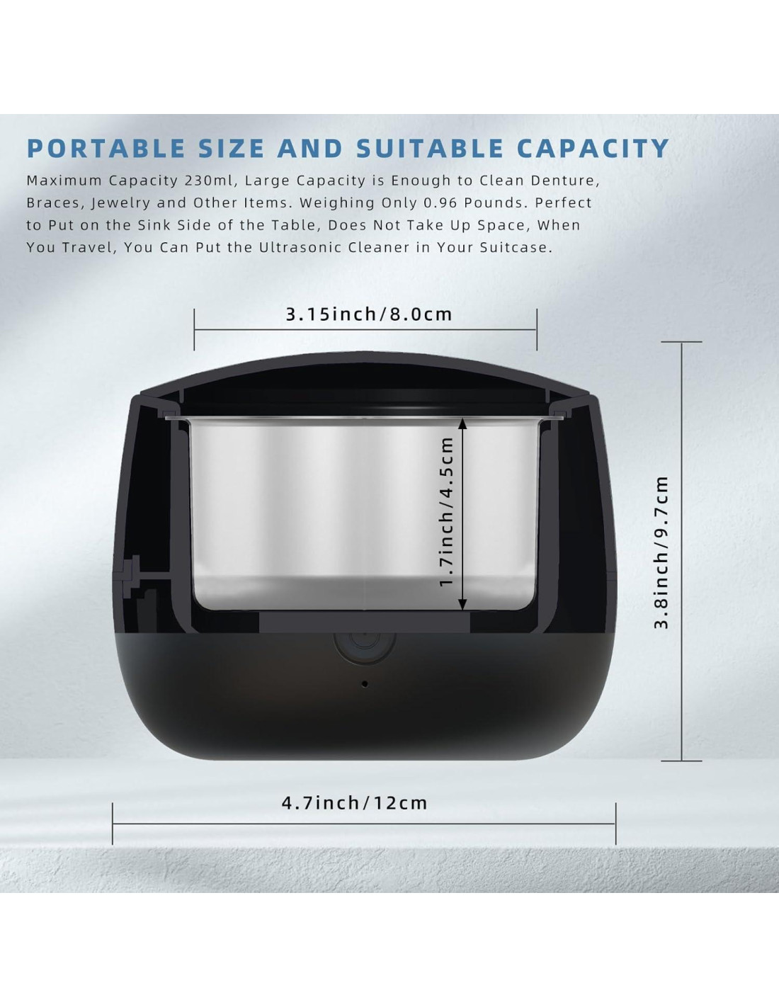 - [Duradero y Bajo Ruido] : La carcasa del limpiador ultrasónico de dentaduras ARGOMAX está hecha de material ABS de alta calidad, con una cámara de acero inoxidable 304 de 9.53 x 4.32 cm, la capacidad máxima es de 230ml, que es resistente y duradera, previniendo efectivamente la corrosión de discos de limpieza, agentes de limpieza y otros líquidos. La parte inferior está equipada con silicona antideslizante circular, que facilita estabilizar el limpiador ultrasónico y reduce efectivamente la vibración y el ruido, haciéndolo más confiable de usar.