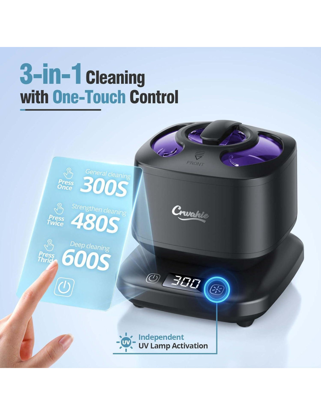 - Modos de Limpieza Ajustables: Diseñado para satisfacer tus diversas necesidades, este limpiador ultrasónico de retenedores Crwahie ofrece 3 modos de limpieza profunda: 300s, 480s y 600s. Simplemente presiona el botón para seleccionar tu modo preferido, ya sea para mantenimiento diario o para abordar manchas difíciles en joyería, dentaduras o retenedores, mucho más fácil de usar y limpiar