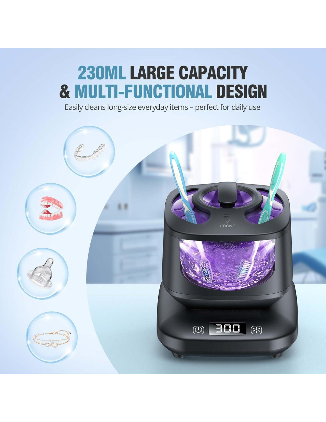 - Luces U-V Eficientes y Limpieza Ultrasónica: Equipado con 4 luces U-V de alta eficiencia, esta máquina limpiadora de retenedores no solo ofrece un potente rendimiento de limpieza ultrasónica de 45kHz, sino que también proporciona una limpieza profunda secundaria para tus artículos a través de la luz U-V en la base. La función de apagado automático de la luz U-V garantiza seguridad cuando la tapa está abierta, ofreciendo tranquilidad durante su uso