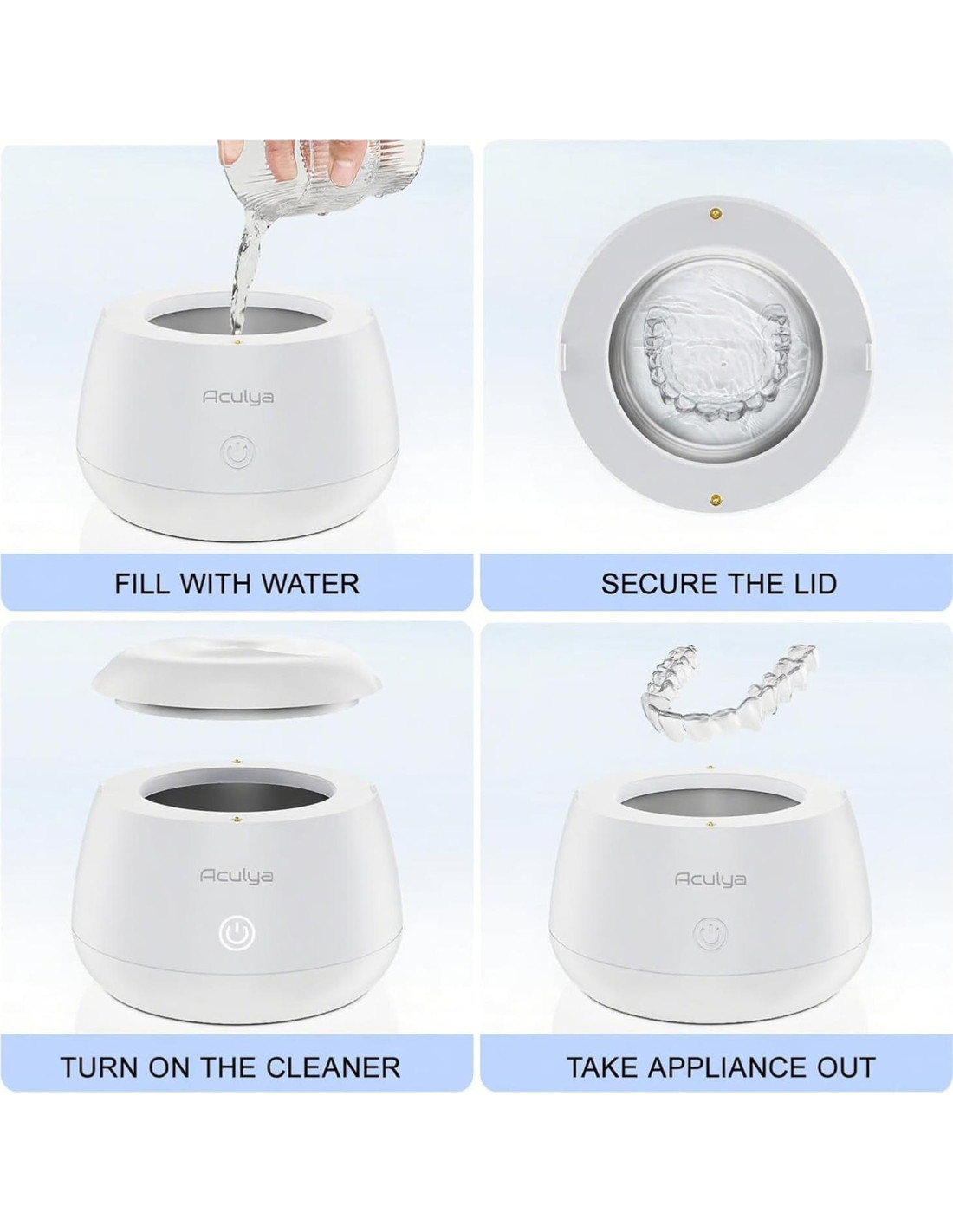 - LIMPIADOR DENTAL ULTRASÓNICO HECHO PARA UNA LIMPIEZA EFICAZ: ¡Solo presiona un botón! solución de limpieza definitiva con este limpiador dental ultrasónico, da a tus retenedores, dentaduras, protectores bucales, brackets, protectores nocturnos, cepillos de dientes y joyería un aspecto renovado sin esfuerzo.