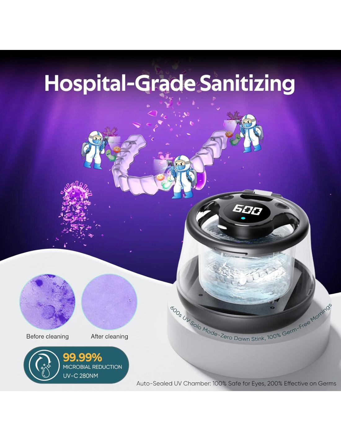 - Protección Dual de Higiene - Nuestra máquina limpiadora de dentaduras tiene 4 luces U/V que operan junto a ciclos ultrasónicos o de forma independiente, ayudando a mantener la frescura de los aparatos dentales y pequeños artículos personales entre limpiezas a fondo. (Nota: Para uso independiente. Es una limpieza U-V de 600s, de lo contrario, la duración U-V se ajusta automáticamente para coincidir con el modo de limpieza seleccionado.)