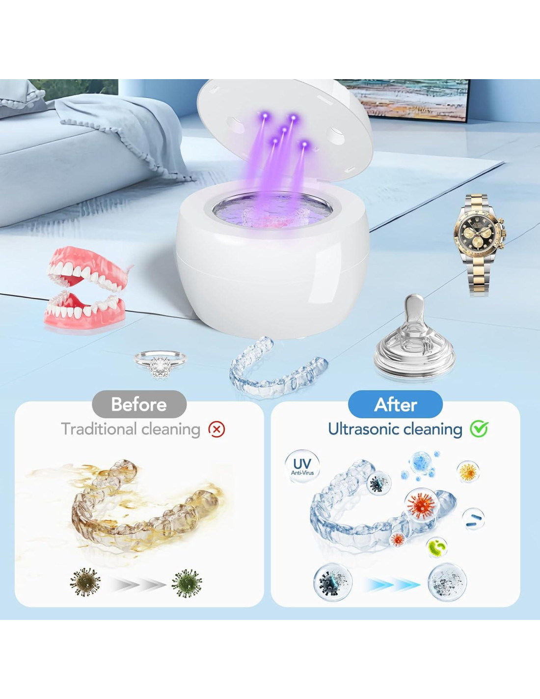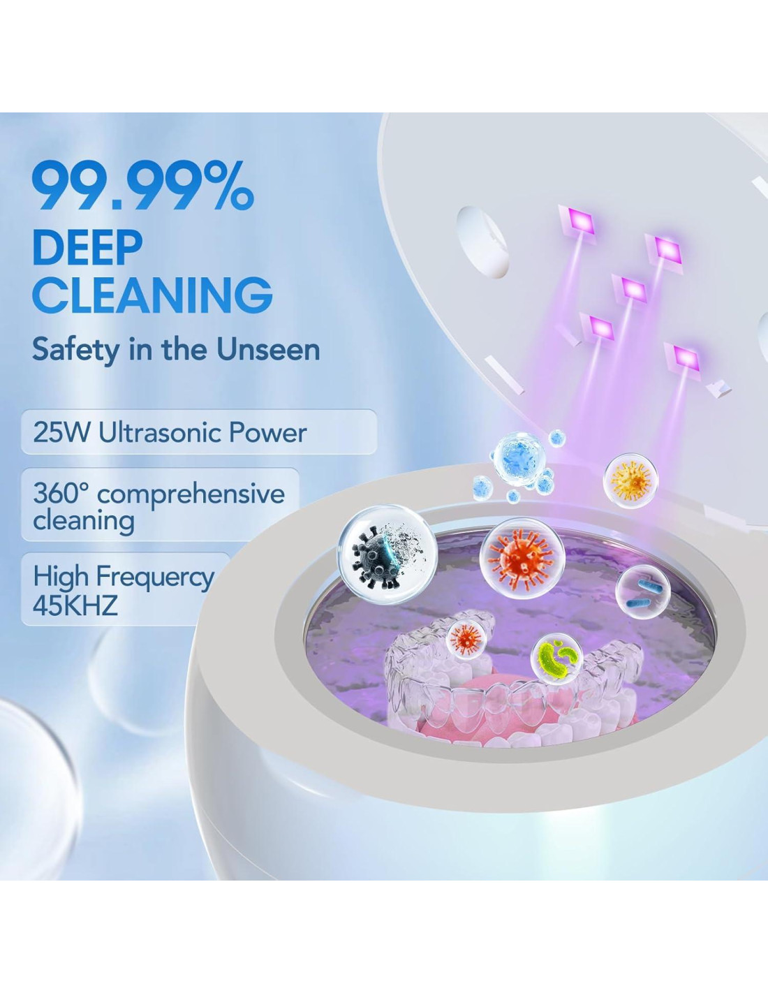 - Operación Simple con un Solo Toque - Disfruta de una limpieza sin esfuerzo con un solo botón. Solo agrega agua, coloca tu artículo y activa para una limpieza profunda rápida de 5 minutos. Esta operación sencilla asegura una limpieza eficiente con un esfuerzo mínimo, perfecta para el uso diario.