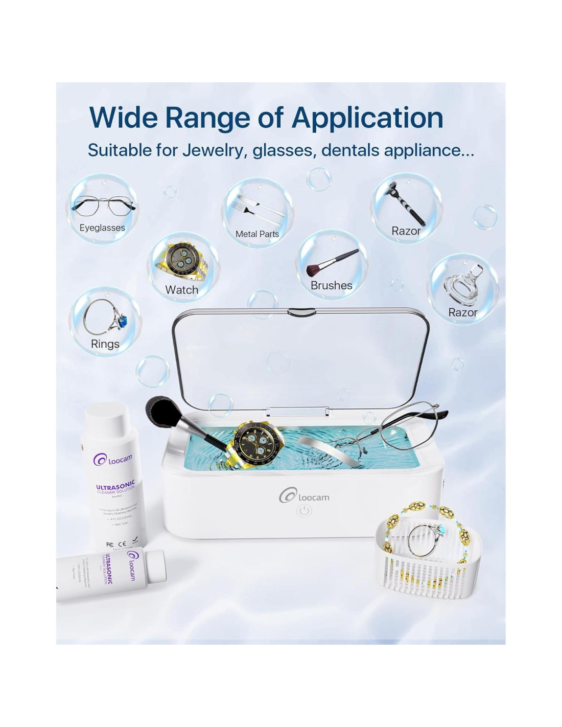 - Limpiado Ultrasónico Profundo El limpiador ultrasónico de joyería Loocam soporta una frecuencia de vibración de 46,000Hz, generando burbujas microscópicas que limpian efectivamente la suciedad de manera 360, sin dañar los artículos que se están limpiando. Agregar la solución limpiadora ultrasónica de 120ML incluida puede mejorar aún más el efecto de limpieza.