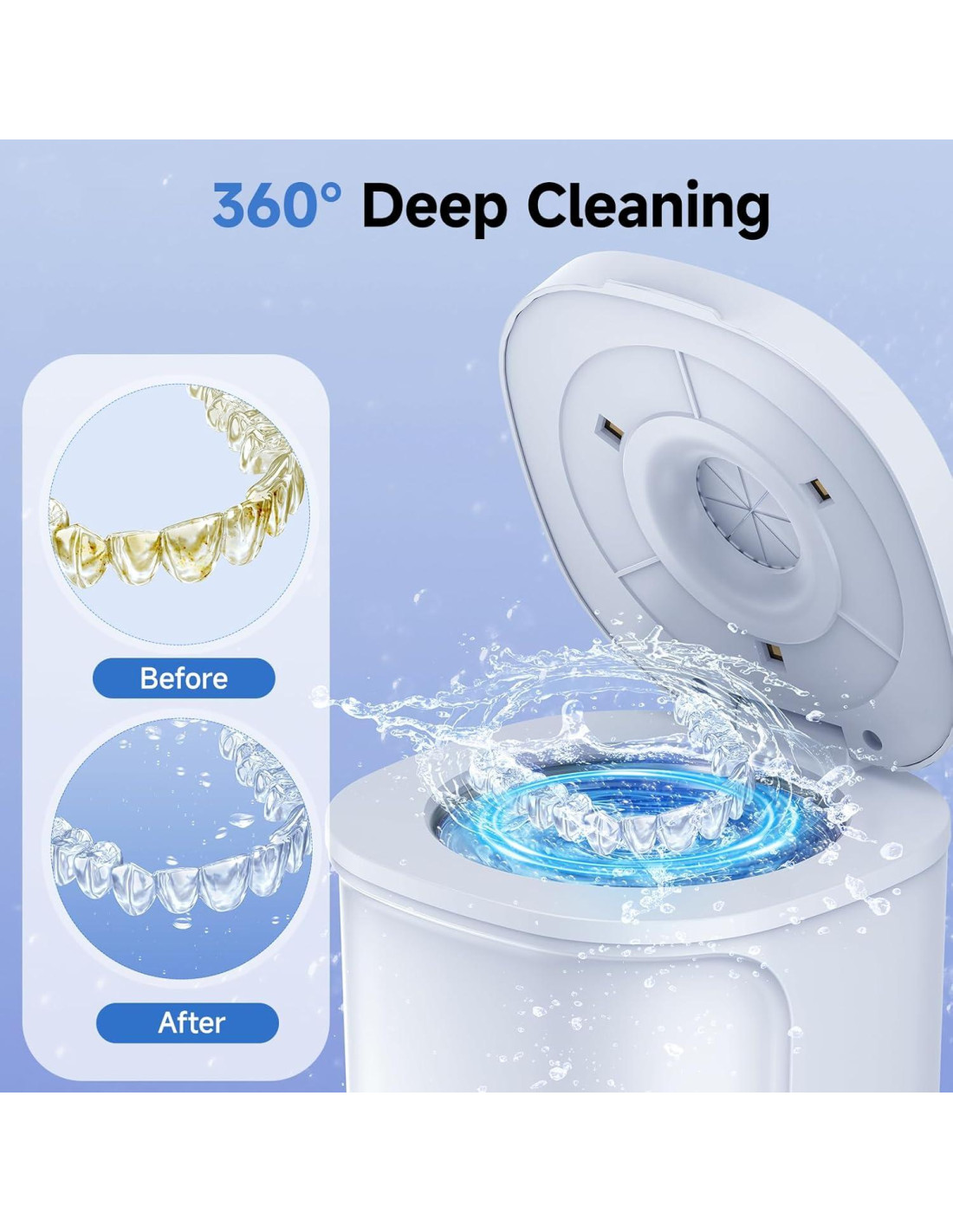- [Tecnología de Limpieza Ultrasónica] El limpiador ultrasónico de dentaduras utiliza ondas sonoras de frecuencia ultrasónica óptima de 45kHz que crean millones de burbujas a nanoescala, y cada burbuja se forma y colapsa alrededor de tus aparatos dentales, creando energía que elimina a fondo la placa, partículas de comida y manchas incluso de los rincones más intrincados. Asegura una limpieza profunda de 360 grados y ahorra tiempo en comparación con el fregado manual.