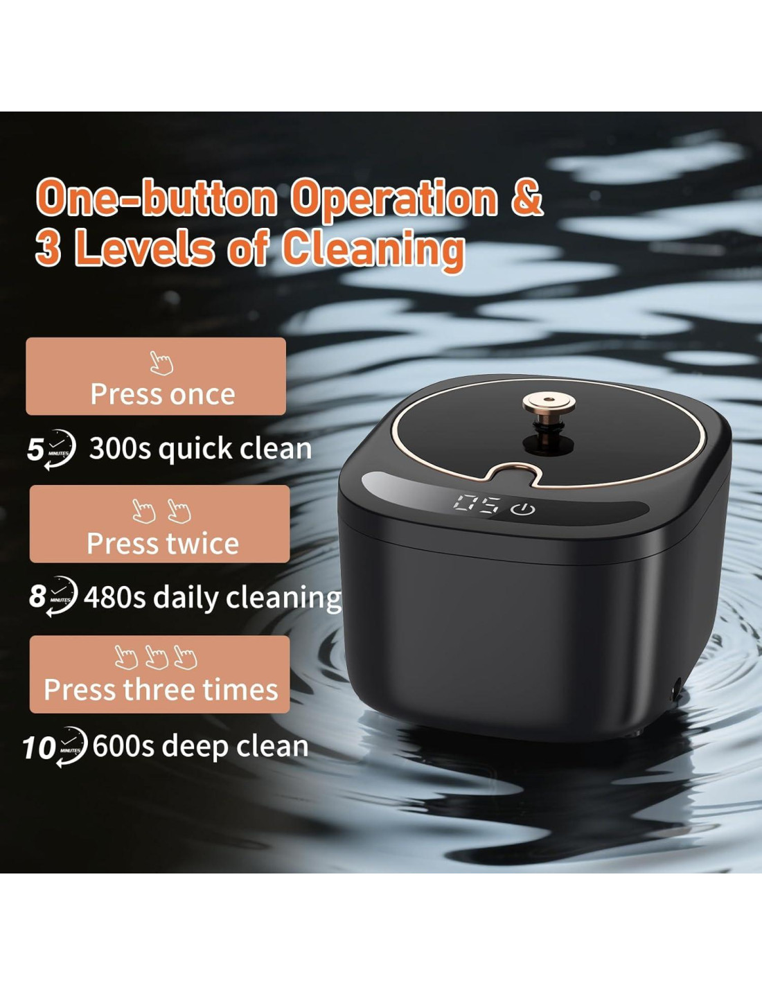 - Operación de 3 Modos Fácil de Usar: Personaliza la intensidad de limpieza con modos de 5/8/10 minutos a través de un control de un toque. El temporizador digital montado en la parte superior muestra el progreso en tiempo real. Para una limpieza profunda de los pods dentales y estructuras complejas de aparatos dentales, puedes alternar al modo de 10 minutos. Las tabletas de limpieza también se pueden colocar a demanda.