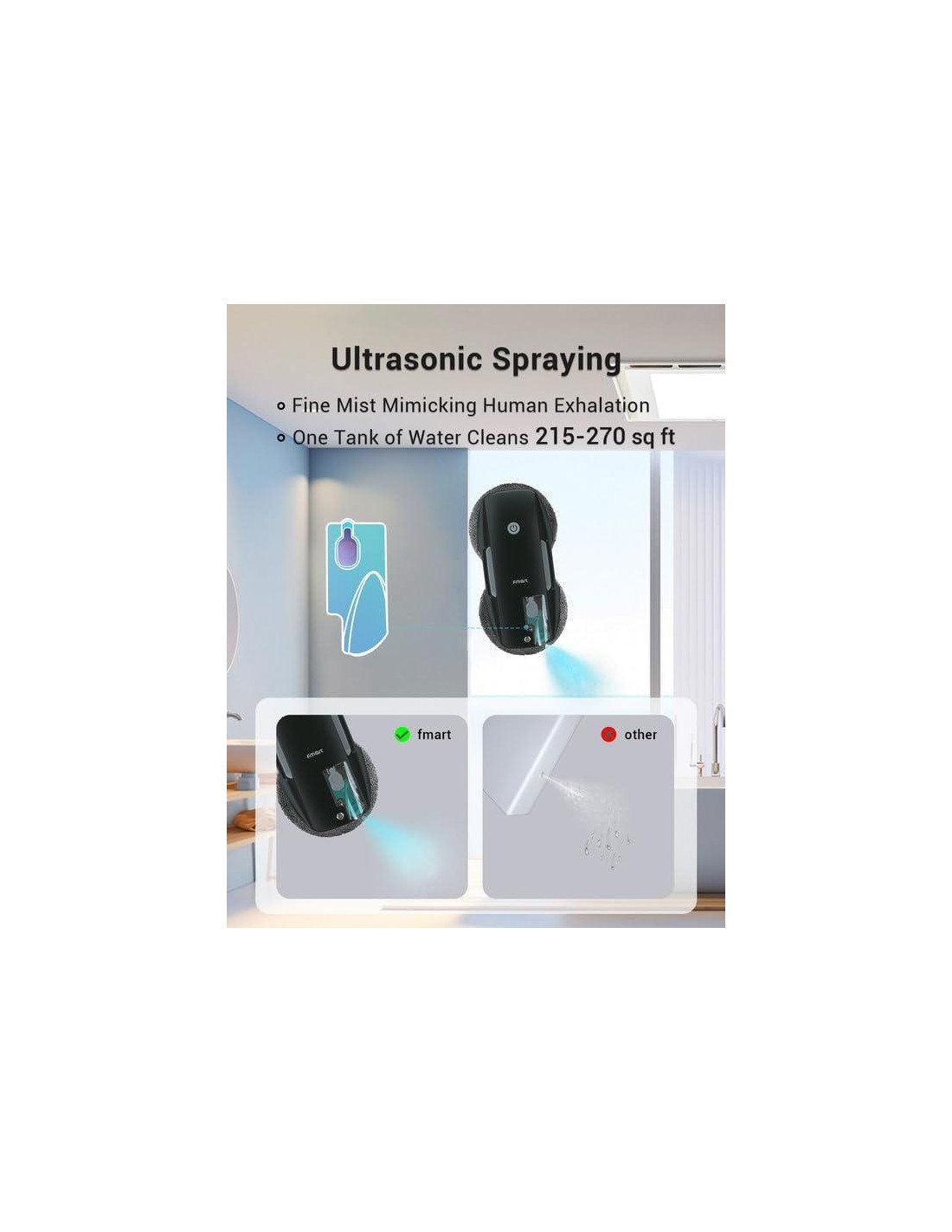- [Tecnología de Atomización Ultrasónica] El Robot Limpiador de Ventanas FMART emplea un diseño automático de agua por atomización ultrasónica distintivo, junto con un tanque de agua eléctrico controlado por presión constante de 25ml, asegurando una cobertura completa del área de limpieza, eliminando de manera fácil y efectiva la suciedad, manchas y rayas de las ventanas.