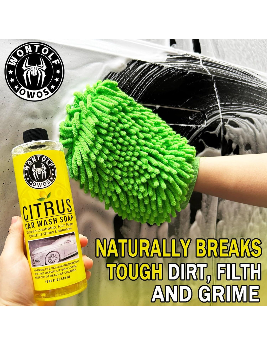 - [Divertido y Gran Valor Dado por un Gran Regalo] - El Kit de Lavado de Autos Wontolf es la colección definitiva de herramientas de limpieza de autos. Y es un regalo para proporcionar diversión a los fanáticos y entusiastas de los autos. Cubre todas las herramientas necesarias para limpiar autos de manera eficiente y mantenerlos brillantes en autos, RVs, SUVs y camiones. Obtendrás 16 oz de jabón para lavado de autos cítrico x1, 16 oz de Limpiador de Interiores x1, 16 oz de Limpiador de Ruedas x1, mitón de microfibra premium x1, cepillo para ruedas/neumáticos x1 y toallas de microfibra x2.