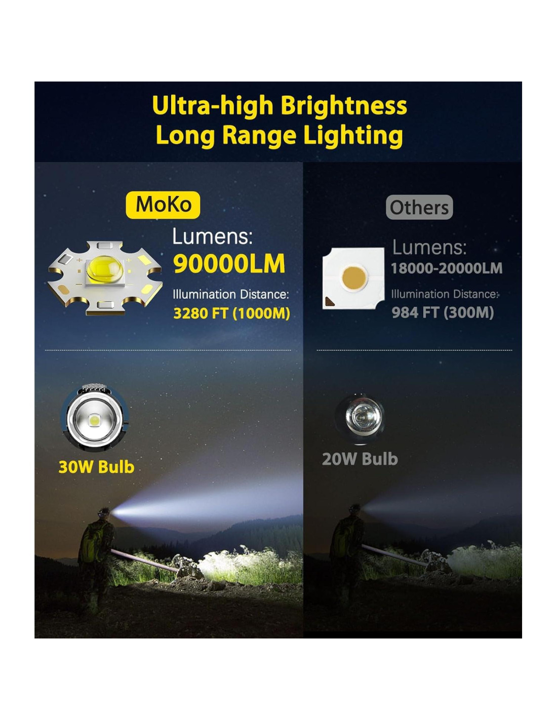 - 90000 Alta Lumen Linterna Frontal & 3280ft (1000 metros) Distancia de Irradiación Larga - La linterna frontal MoKo cuenta con 30W de perlas de lámpara de alta potencia que proporcionan hasta 90000 lúmenes de brillo máximo y un alcance de hasta 3280 pies (1000 metros). Puedes ver todo a tu alrededor claramente incluso en entornos oscuros, asegurando tu seguridad.