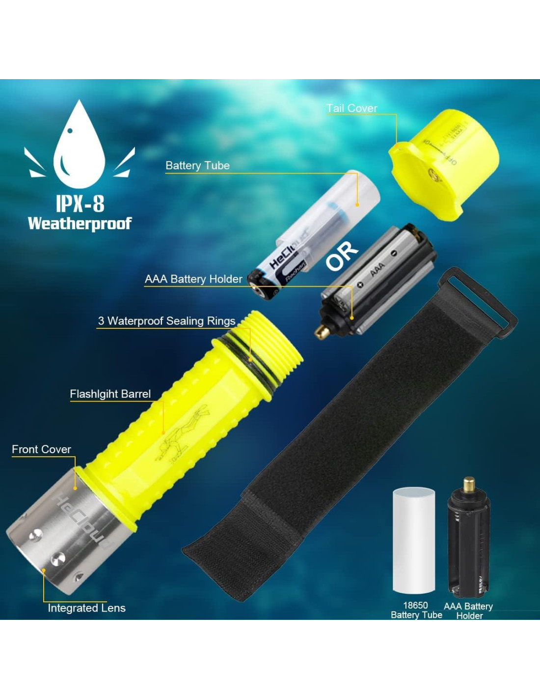 - [Bombillas LED T6 Actualizadas] La bombilla T6 actualizada es más potente y estable que el chip T6. La luz de buceo compacta y superbrillante puede sumergirse hasta 80 pies (24,38 m). Vida útil de hasta 60,000 horas o más, sin necesidad de considerar reemplazar las bombillas durante toda la vida