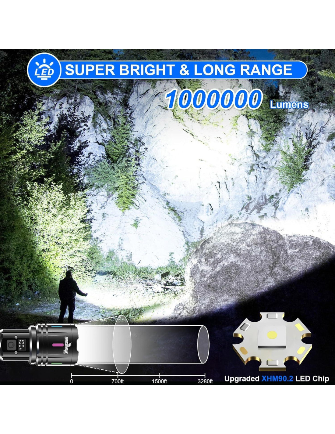 - [LINTERNAS ALTA LÚMENES 1000000] La linterna Shadowhawk S1007 adopta el chip LED XHM90.2 más avanzado, proporcionando una fuente de luz mucho más estable y una mayor penetración de luz que otros LED en el mercado. Con una salida asombrosa, puede penetrar fácilmente el polvo y la niebla, comparable a las luces antiniebla de los automóviles, adecuada para cualquier situación con baja visibilidad. Una habitación de 2160 pies cuadrados o objetos a hasta 3937 pies (1200 m) de distancia pueden ser iluminados fácilmente. Su estilo de diseño único la convierte en un regalo ideal.