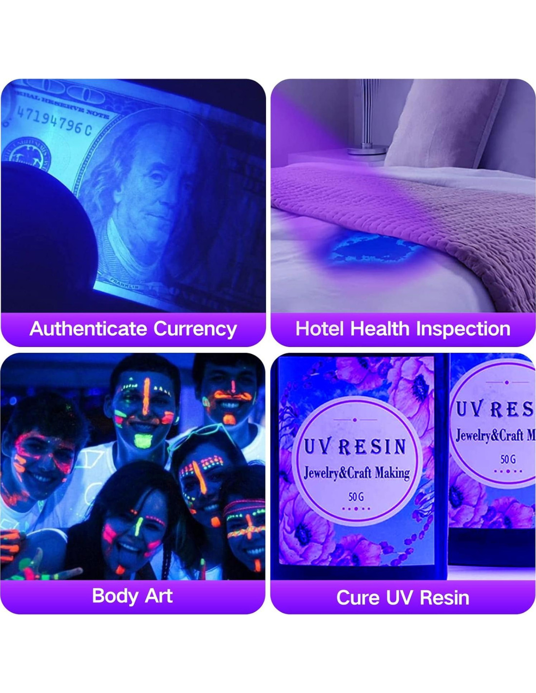 - Uso: Detección de orina de mascotas, encontrar escorpiones difíciles de localizar, curar resina UV, inspección de limpieza de baño/hotel, encontrar chinches, encontrar gusanos del tomate, detección de fugas, verificación de ID/moneda, inspección de vidrio de uranio, para luminiscencia de material luminoso, detección de tiña en gatos, curar esmalte de uñas