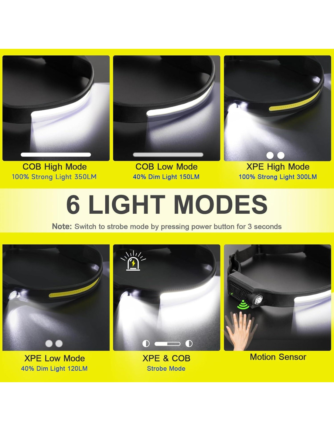 - 6 Modos de Luz Versátiles: La linterna frontal ofrece opciones de iluminación versátiles. Puedes elegir Modo Alto COB, Modo Bajo COB, Modo Alto XPE, Modo Bajo XPE, Modo Estroboscópico, Sensor de Movimiento. Mientras que una presión de 3 segundos del botón de encendido activa el modo estroboscópico para emergencias