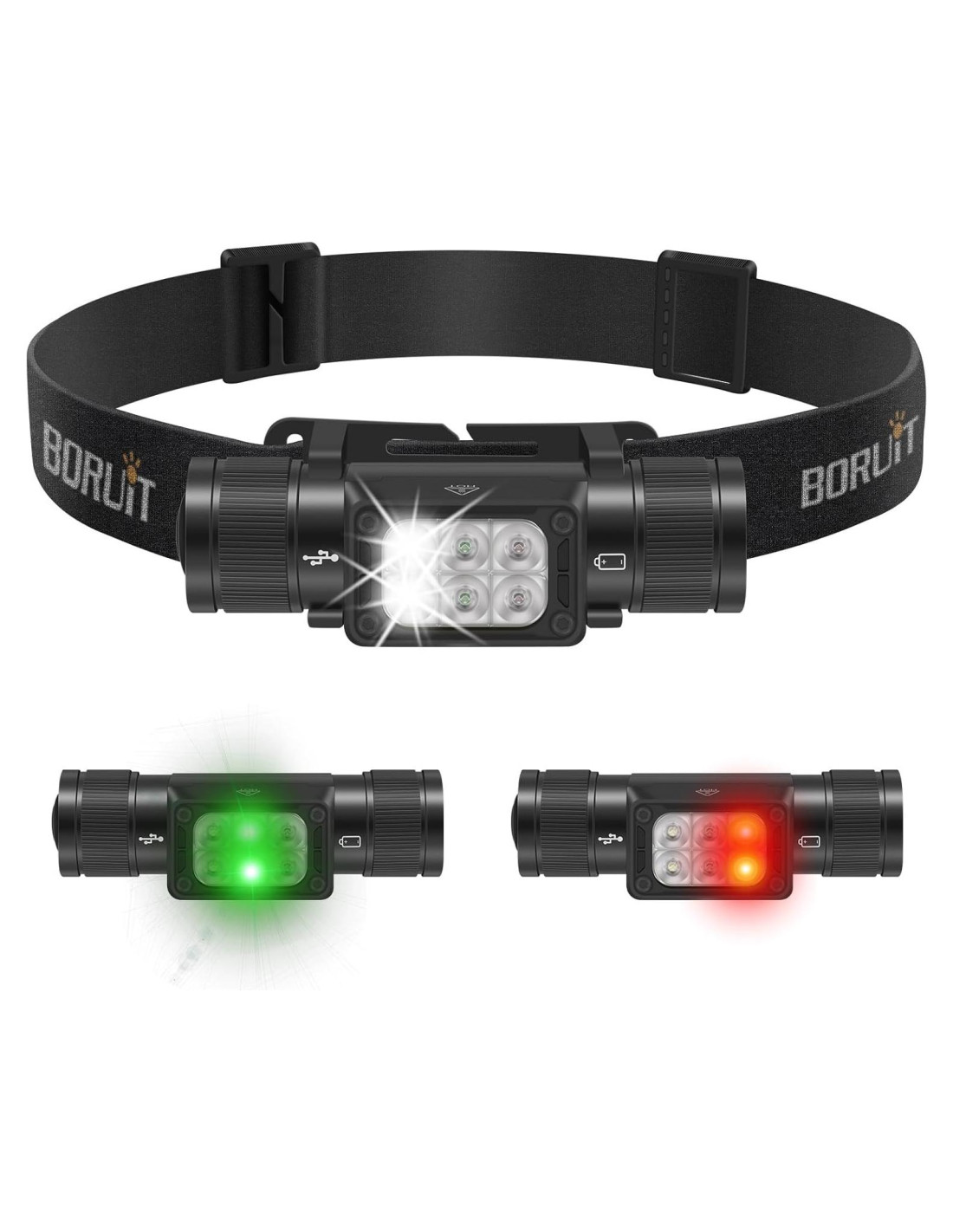 - Linternas Frontal Súper Brillantes y de Largo Alcance con Luz Tricolor. Nuestra linterna frontal Boruit HP360 utiliza 2 luces blancas, 2 luces verdes y 2 luces rojas, con un máximo de hasta 1000 lúmenes y puede iluminar distancias de hasta 100 metros, lo que puede disipar fácilmente la oscuridad e iluminar todo el patio o incluso la montaña, diseño de fuente de luz tricolor, puede satisfacer tus diferentes necesidades de iluminación por la noche. El gran regalo del Día del Padre para hombres.