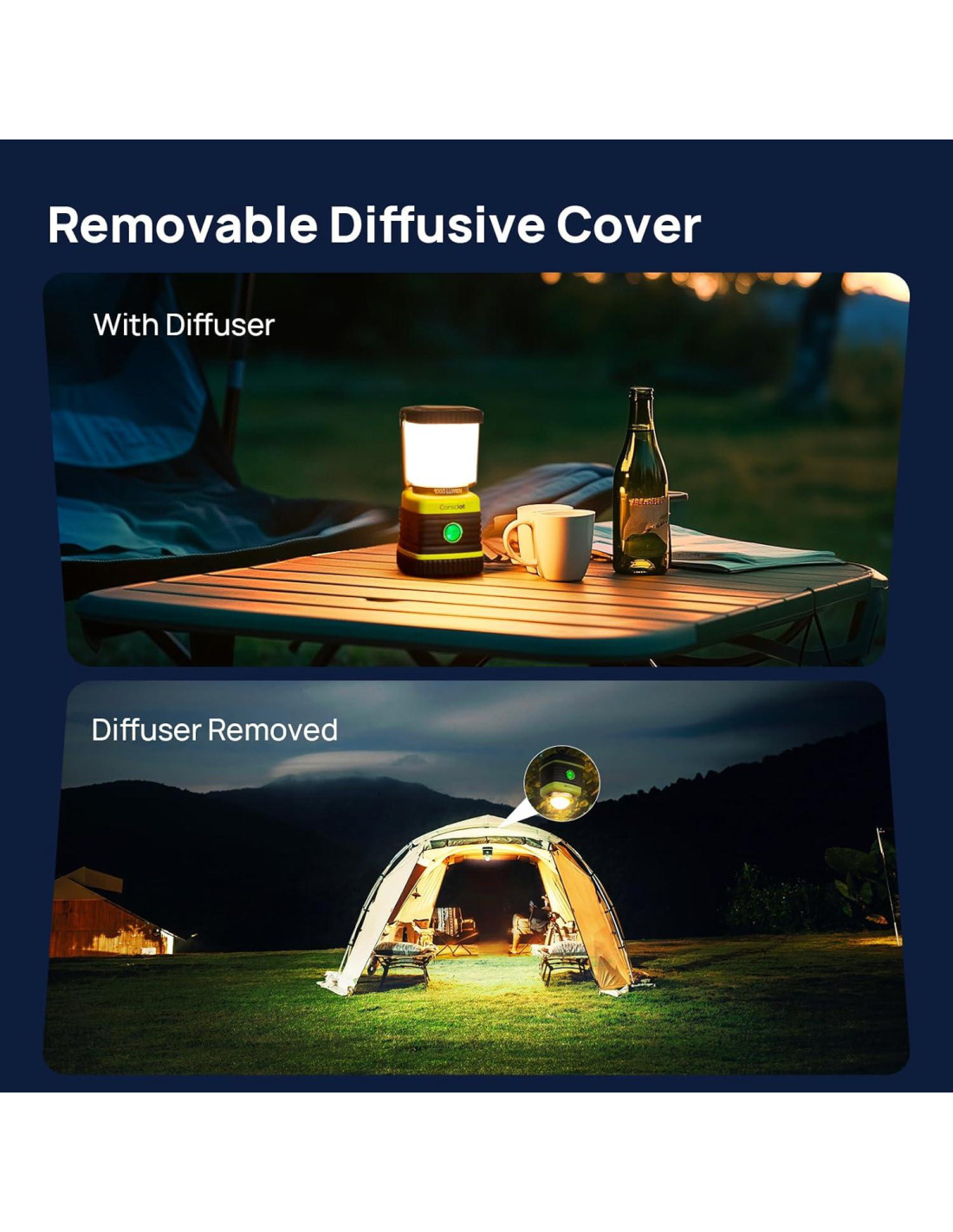 - Ganchos de Colgado de Dos Vías y Tapa Removible: Use el mango incorporado en la parte superior para llevar o colgar la linterna ligera, o retire el difusor y use el gancho en la parte inferior para colgar la linterna boca abajo para iluminar un área más extensa