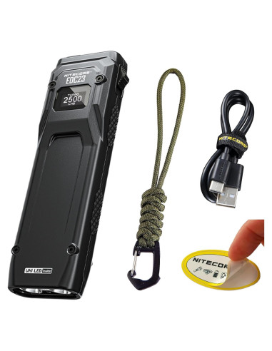 - CONTENIDO - Linterna Nitecore EDC23, cable de carga USB-C, cordón y adhesivo de Nitecore