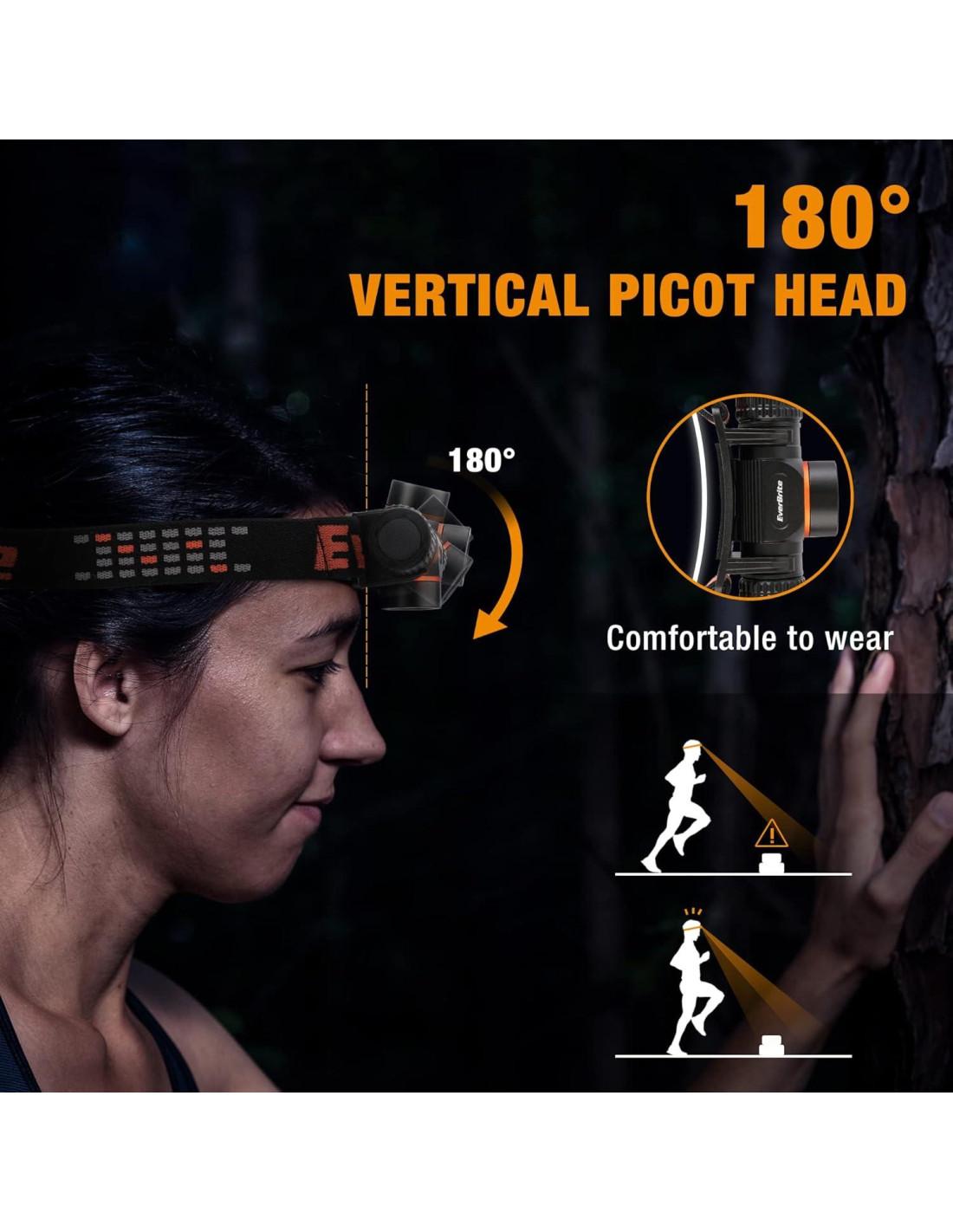 - Super Brillo: Equipado con luces LED de 1000 lúmenes, nuestra linterna frontal recargable Everbrite mejorada puede proyectar un haz super brillante de 122 metros (400 pies) para iluminación a larga distancia por la noche. 5 niveles de brillo y 3 modos incluyendo SOS estroboscópico.