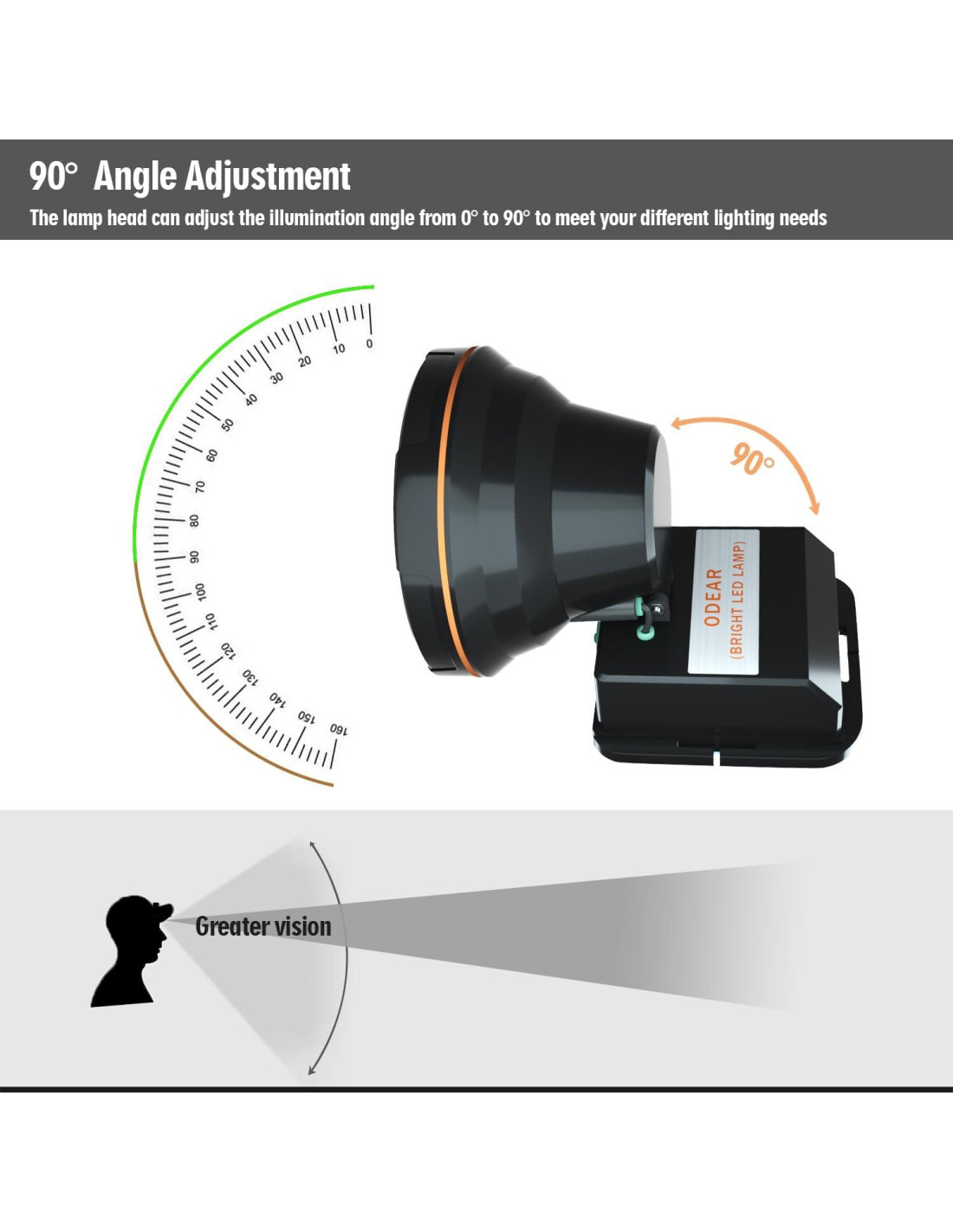 - Foco de Ángulo de Haz Ajustable: Ajusta fácilmente el ángulo del haz de 0 a 90 grados para una experiencia de iluminación personalizable. La banda elástica ajustable asegura un ajuste estable y cómodo.