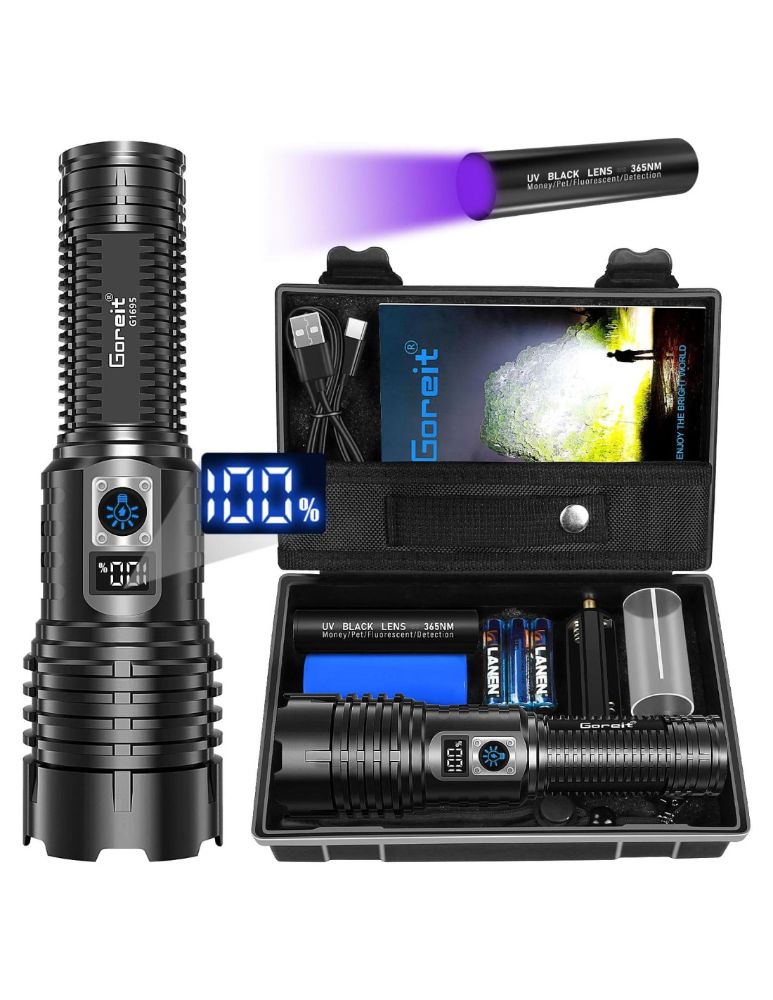 - KIT DE LINTERNAS POTENTES DE GRAN VALOR MEJORADO: Lo que recibirás: 1x linterna de alto poder Goreit G1695, 1x linterna UV de luz negra, 1x batería potente y cable de carga USB, 3x baterías AAA, 1x cordón y funda, 1x manual y caja de regalo. Te sorprenderá gratamente el brillo, la calidad, la longevidad y el rendimiento de las linternas LED de alto lúmenes. Si tienes alguna pregunta sobre la linterna LED, no dudes en contactarnos. Estaremos encantados de responder tus preguntas.