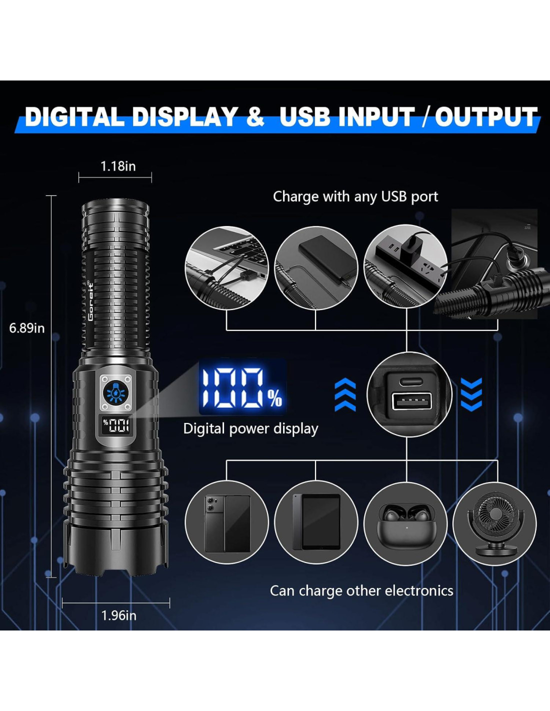 - PANTALLA LCD DE POTENCIA | LINTERNAS RECARGABLES | SALIDA USB: Esta linterna de alto lúmenes recargable ha sido mejorada con una pantalla de porcentaje de potencia LCD única, de un vistazo, siempre puedes conocer la potencia restante. Además, esta linterna ha sido completamente mejorada para acortar el tiempo de carga y extender la vida útil, lo que puede proporcionar hasta 12 horas de brillo potente y no decreciente. Interfaz USB incorporada, es más conveniente cargar. También puede cargar el teléfono.