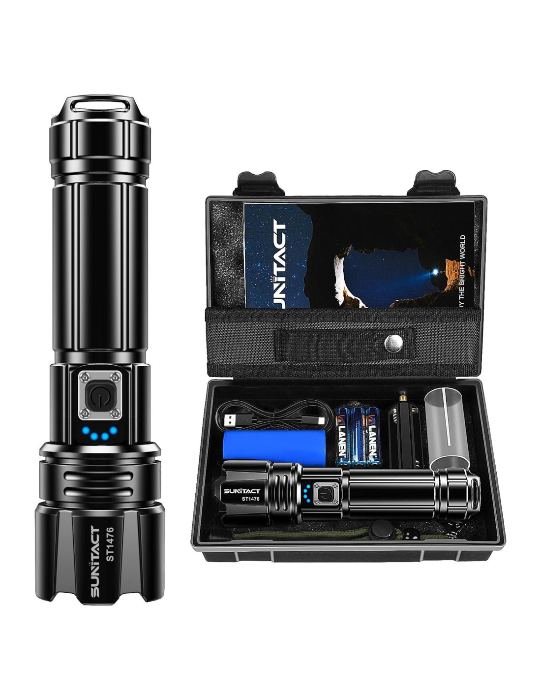 - 2000 LÚMENES LINTERNAS LED: Las linternas Sunitact ST1476 de alto lúmenes cuentan con un avanzado chip LED XHP70.2 incorporado, con una potente salida de 2000 lúmenes, proporcionando la gran luz que deseas, ilumina fácilmente una habitación de 120 metros cuadrados. incluso podemos enfocar objetos a hasta 1000 pies (304,8 m) de distancia, aproximadamente la longitud de 3 campos de fútbol. Y podemos poner todas las partes en la caja de regalo para un fácil transporte y almacenamiento. Además, esta linterna brillante también es un regalo ideal para nuestros amigos o familiares.