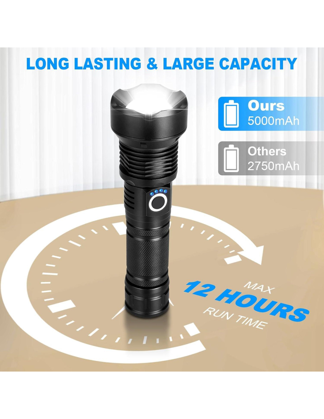 - 990,000 Lúmenes Súper Brillante: Con el chip LED P90.8 mejorado, nuestras linternas de altos lúmenes iluminan tu entorno con una impresionante salida de 990,000 lúmenes y una distancia máxima de luz de 3280 pies (1000 m). Ya sea que estés acampando, haciendo senderismo u otras actividades al aire libre, nuestra linterna súper brillante proporcionará la iluminación confiable que necesitas.