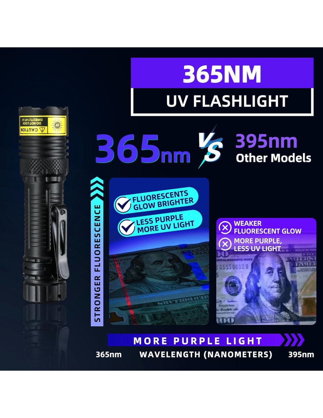 - LINTERNAS UV 365NM MINI PERO PODEROSA MEJORADA-- Hecha con perlas LED UV potentes mejoradas, con una potencia de hasta 10W. La luz de 365nm es una verdadera luz UV invisible, que parece menos brillante que la luz de 395nm porque es invisible para el ojo humano. Pero es más adecuada para inspecciones exigentes, ya que mostrará una clara luz azul púrpura cuando brille sobre objetos que contengan agentes fluorescentes, códigos de seguridad o marcas de agua.