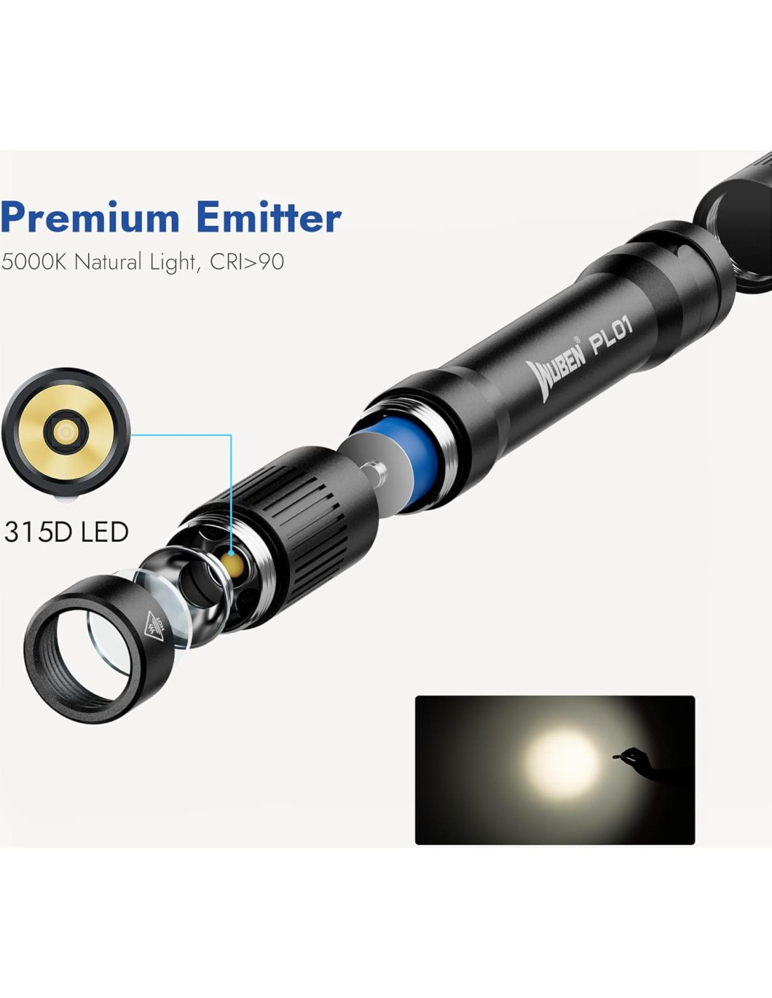 - DISEÑO ULTRA-COMPACTO Y AMIGABLE CON EL BOLSILLO: La linterna de bolsillo de cuerpo delgado tipo bolígrafo (solo 13.5 cm x 1.5 cm, peso 45 g), se adapta fácilmente a un bolsillo, estuche para bolígrafos o mochila para uso en movimiento. Asegura un acceso rápido y un transporte cómodo para el uso diario (edc), desplazamientos diarios, viajes de negocios o camping.