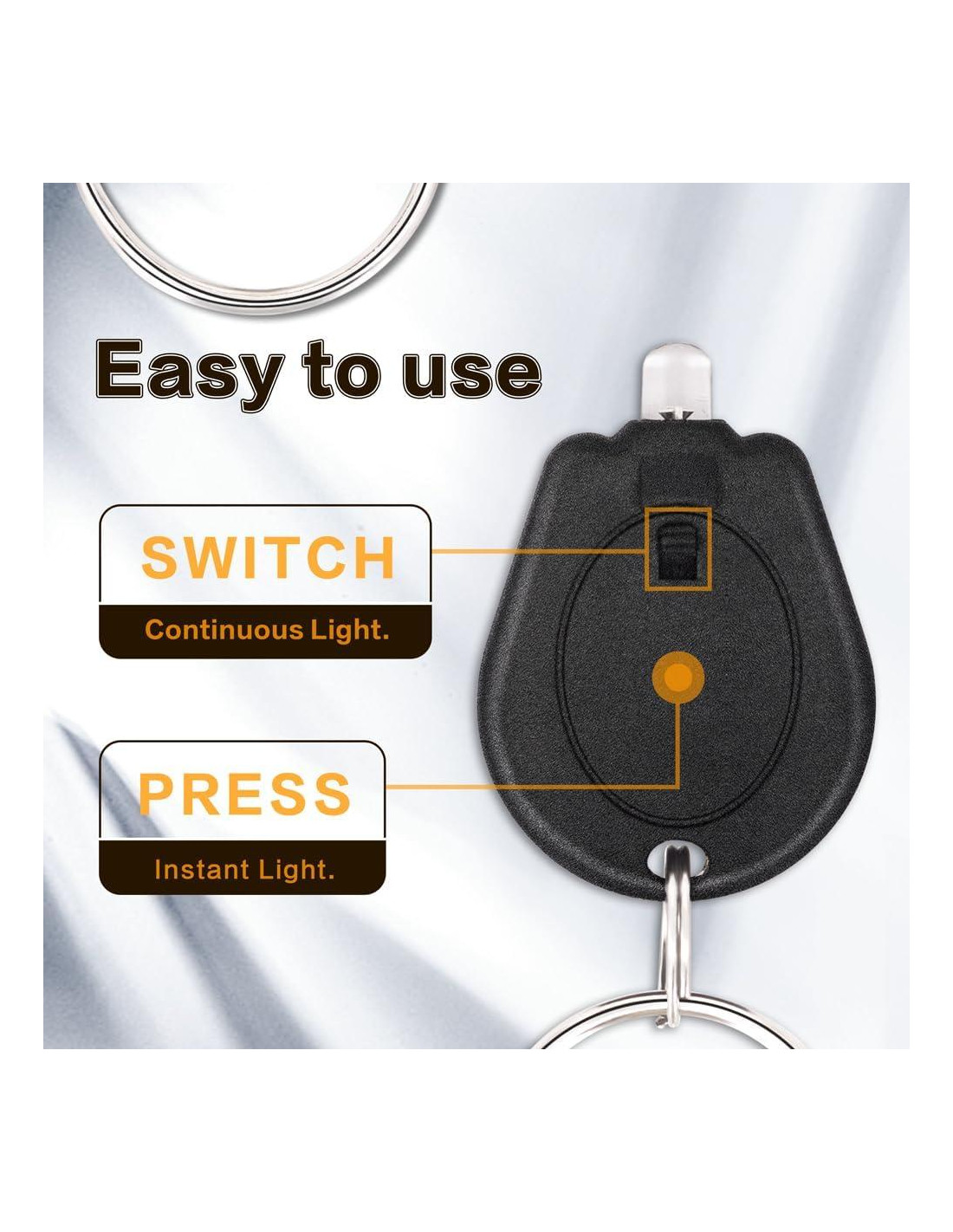 - Dos Métodos de Uso Fácil: (1) Luz Instantánea para Llave: Aprieta ligeramente el medio de las linternas de llavero con tus dos dedos para activar la luz instantánea; (2) Luz Continua: Desliza el Interruptor de Encendido/Apagado para encender o apagar la linterna LED mini de llavero.