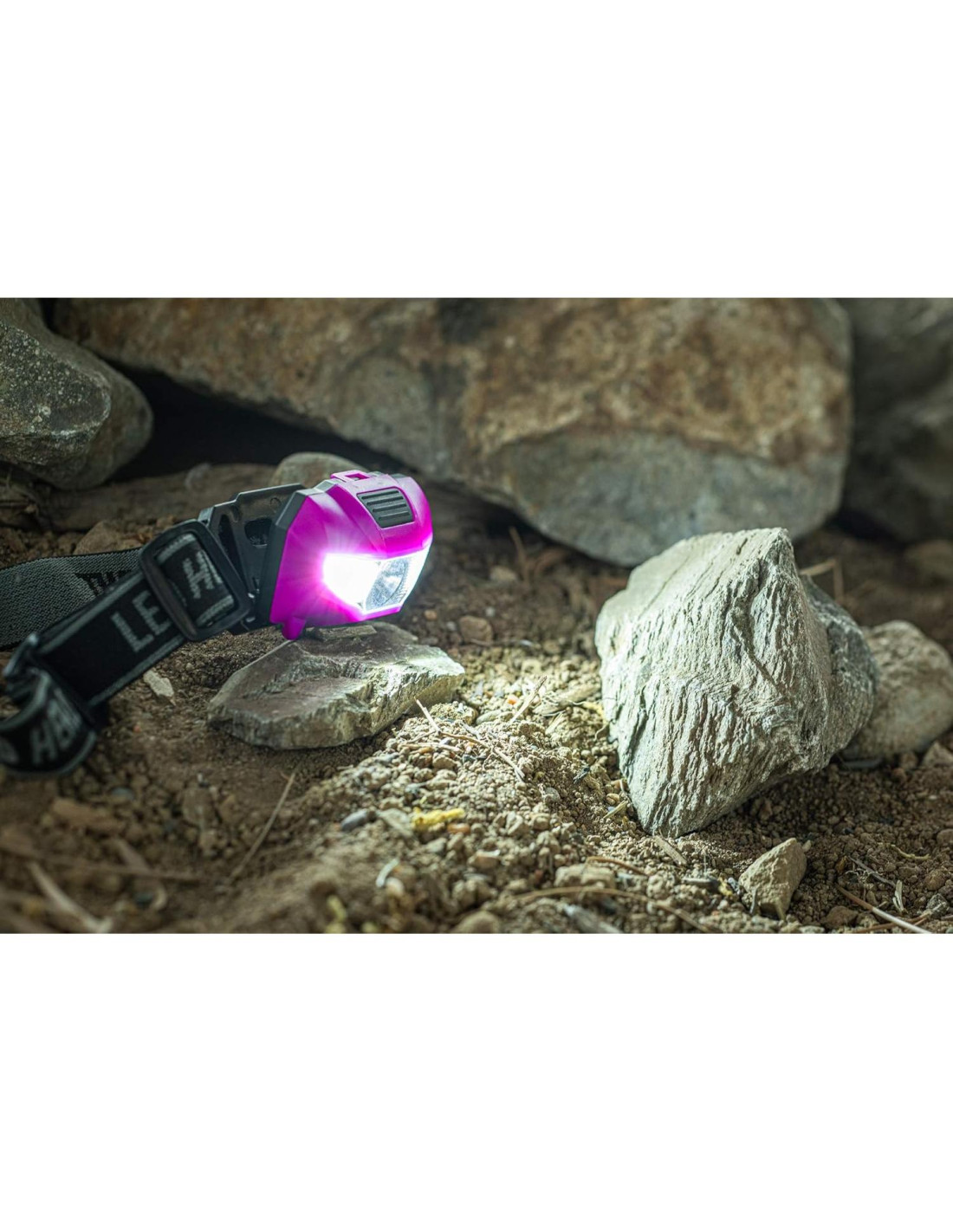 - La linterna frontal de luz negra/LED blanca cuenta con un interruptor de 4 etapas: ultravioleta alto, ultravioleta bajo, luz blanca y luz blanca intermitente. Presiona el botón en la parte superior de la linterna frontal para usar el interruptor de 4 etapas.
