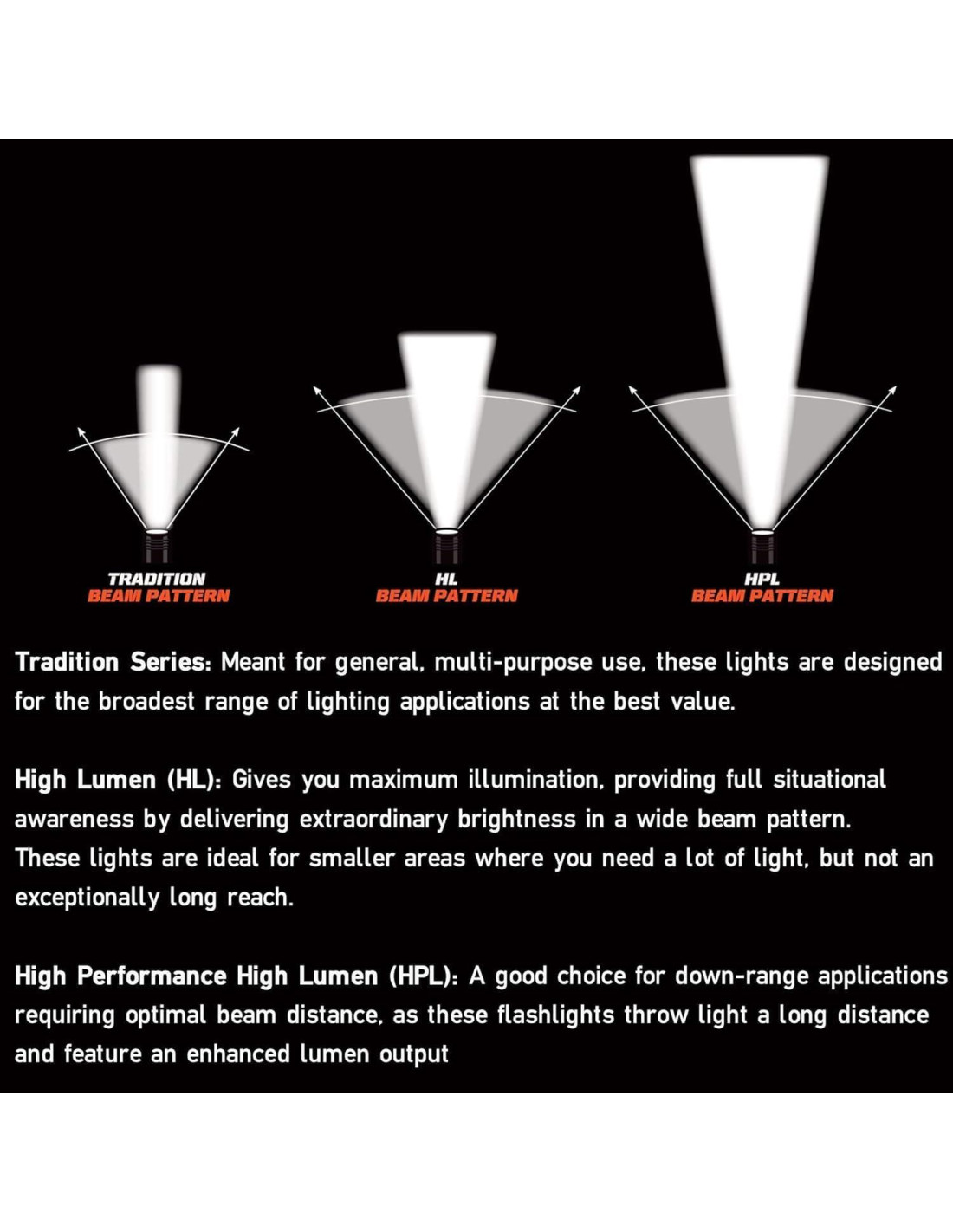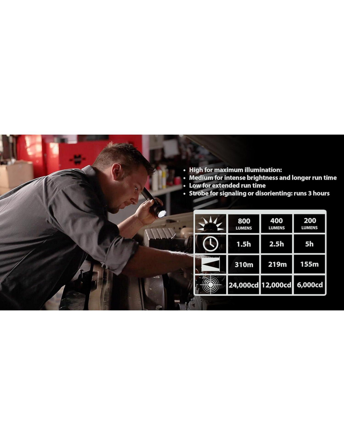 - Bajo para tiempo de funcionamiento prolongado: 200 lúmenes; 6,000 candelas; 155m de haz; funciona 5 horas