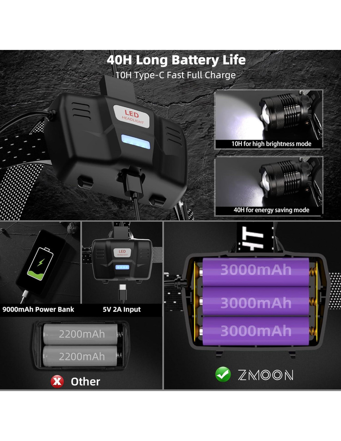 - 40H Larga Duración de Batería: 3*3000mAh baterías para alimentar tus aventuras, proporcionando asombrosas 40 horas de iluminación ininterrumpida en modo de ahorro de energía (8-10 horas en modo de alta brillantez). Di adiós a los constantes cambios de batería y extiende tu tiempo de uso para que puedas concentrarte en tus aventuras sin interrupciones. Una excelente duración de batería asegura una fuente de luz confiable durante largos viajes al aire libre o tareas difíciles, reafirmando la fiabilidad de la linterna frontal.