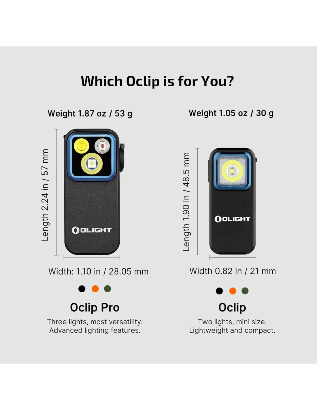 - Oclip Pro: [Tres Soluciones de Iluminación] La primera luz clip-on de Olight que presenta una luz de inundación con 500lm, un foco de 120 metros de alcance, y luz roja de 40/4lm diseñada para satisfacer diversas necesidades.