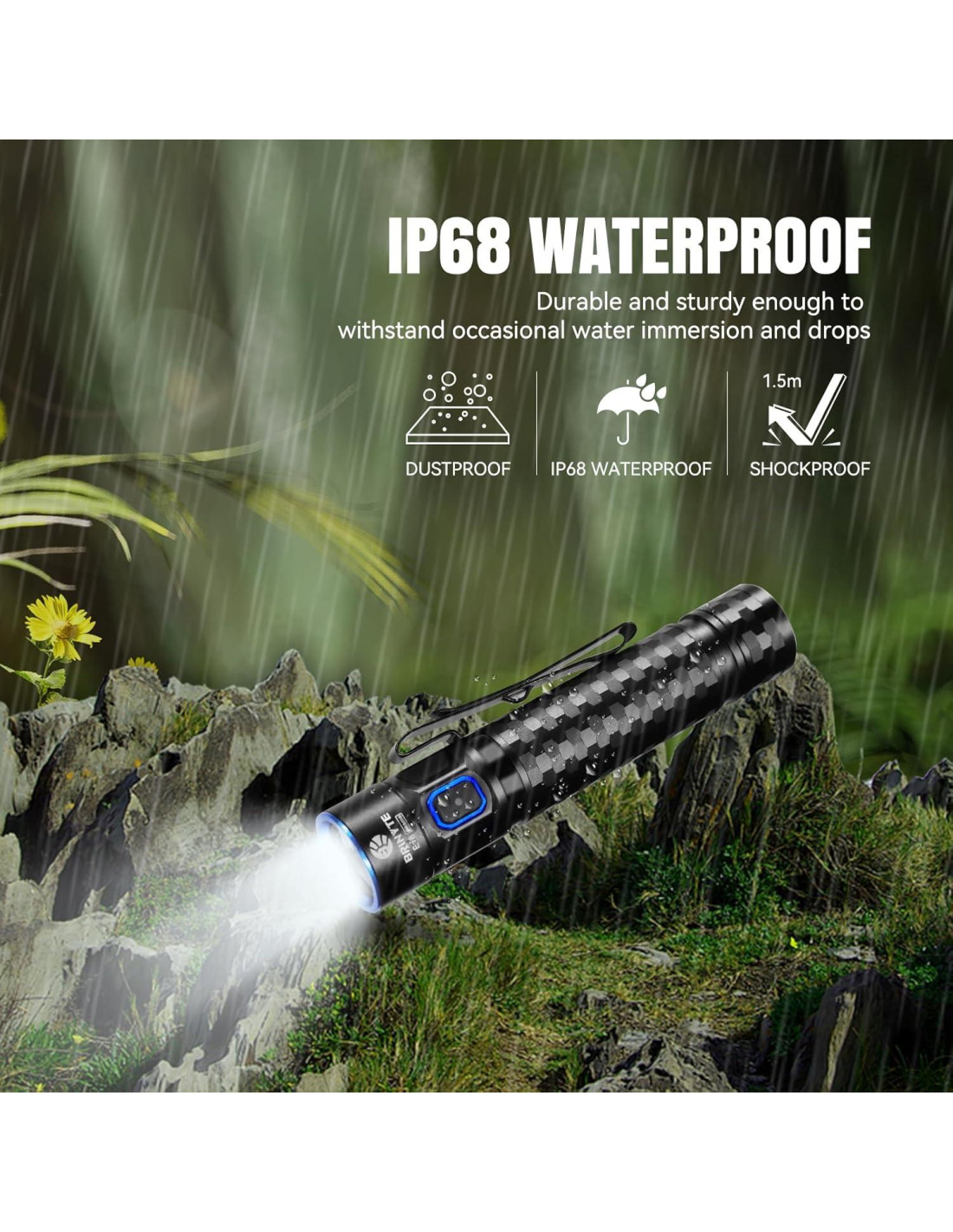 - Duradera y Resistente: Construida de aluminio AL-6061-T6 con un acabado anodizado duro premium, la luz de bolsillo E18 es IP68 impermeable, a prueba de golpes y resistente a la abrasión, capaz de soportar diversas condiciones climáticas extremas.