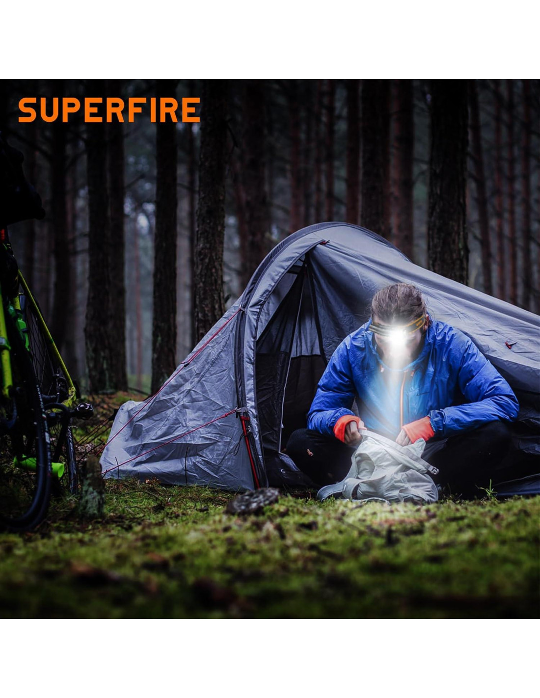 - POTENTE: La linterna THo4 equipada con luces LED XG2 de 600 lúmenes, nuestra linterna de cabeza de segunda generación Superfire puede proyectar un haz súper brillante de 18.3 metros (60 pies) para iluminación de largo alcance por la noche. 5 niveles de brillo para adaptarse a todas las situaciones.