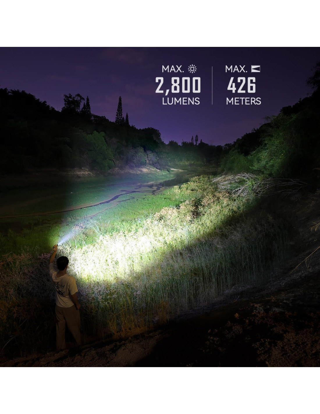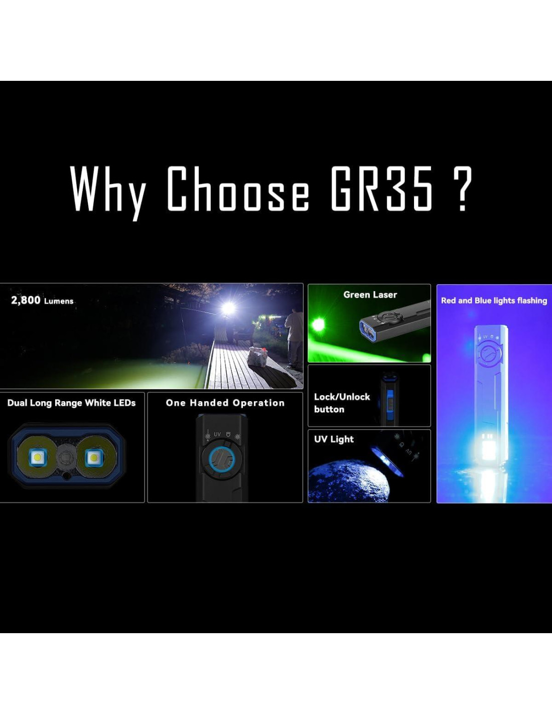 - Funcionalidad Cuatro en Uno - El Imalent GR35 es una linterna de ultra alto rendimiento con una salida de 2800 lúmenes y un alcance máximo de haz de 426 metros. Combina luz blanca, UV, luz roja-azul parpadeante y haz verde en una sola linterna, ofreciendo versatilidad para una amplia gama de aplicaciones.
