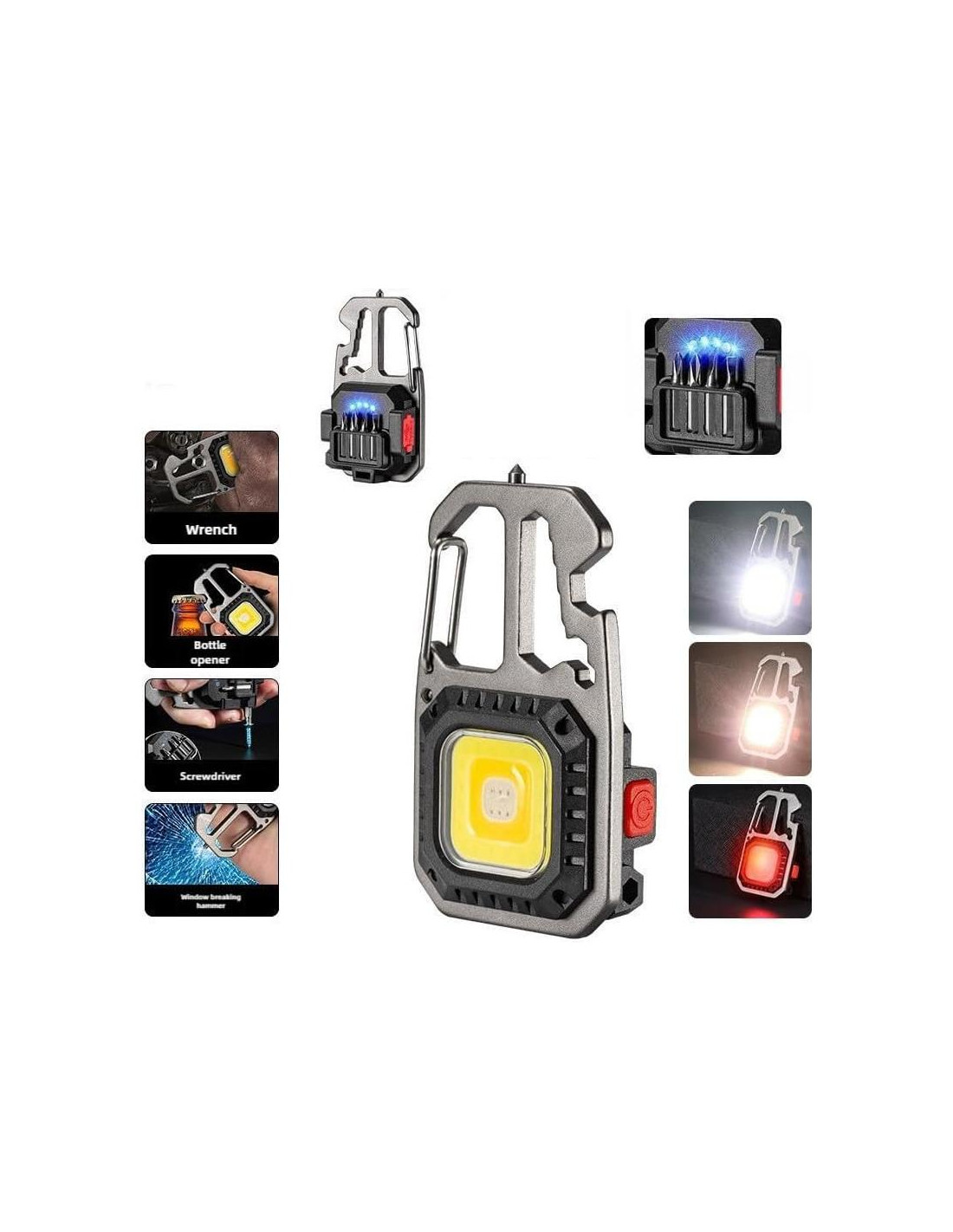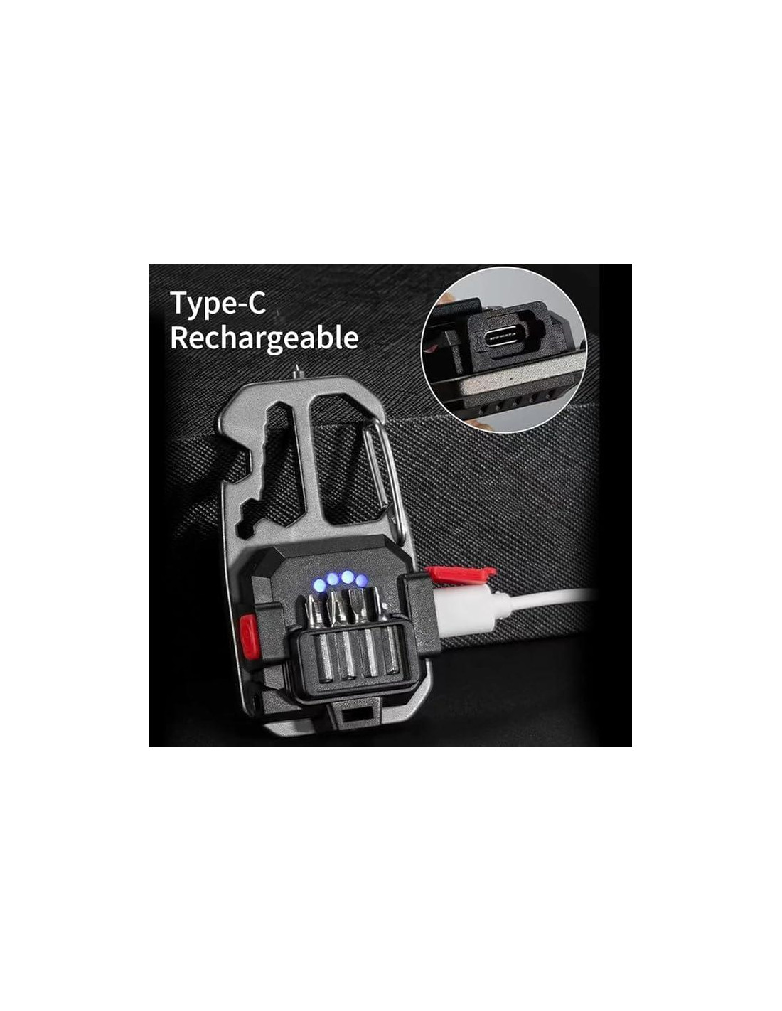 Linterna de Llave Multifuncional - Esta linterna de llavero COB está equipada con 4 destornilladores de diferentes tamaños + 1 llave inglesa + abrebotellas + martillo rompe ventanas de emergencia, que es perfecta para manejar diversas emergencias. Linterna COB Brillante de Bolsillo - Esta mini linterna recargable de llavero es lo suficientemente potente como para emitir 500 lúmenes de luz. La tecnología de fuente de luz COB puede proporcionar luz brillante desde múltiples ángulos amplios, y puede usarse durante aproximadamente 4-8 horas. Puede funcionar para camping, pesca, reparación y iluminación de emergencia. 7 Modos de Luz con Luz Roja - Las linternas de llavero tienen 7 modos de luz: Luz Blanca Brillante, Luz Blanca Tenue, Luz Cálida Brillante, Luz Cálida Tenue, Luz Roja Brillante, Luz Roja Estroboscópica, Modo Súper Brillante (Presione para cambiar). En caso de una emergencia mientras explora al aire libre, use la luz roja para atraer la atención de otros y pedir ayuda. Recargable Tipo-C y Pantalla de Potencia de Cuatro Cuadrantes - Esta linterna de trabajo de llavero recargable es alimentada por una batería recargable de 500mAh incorporada, se incluye un cable de carga Tipo-C para conectarla a cualquier fuente de poder USB. Con pantalla de potencia para ayudar a monitorear el uso de energía en tiempo real, así como cargarla cuando su energía es insuficiente. Impermeable y de Uso Amplio - Esta linterna LED de llavero multifuncional está hecha de material de aleación de aluminio de alta calidad, que es impermeable IPX6, resistente a la corrosión, no se oxida ni rompe fácilmente, reutilizable y duradera. Adecuada para pesca, senderismo, paseos nocturnos, inspección y reparación de automóviles, patrullas nocturnas, autoprotección.