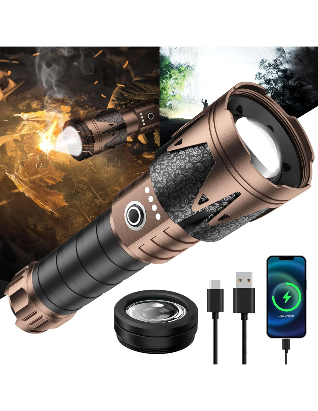 - [Linterna Zoomable Súper Brillante] La linterna LED SKYFIRE ofrece 2000000lm de alta luminosidad y una distancia de haz que puede alcanzar 1585 metros (5200 pies). Su función de zoom ajustable mediante el Cabezal Estirable le permite cambiar entre luz puntual y luz de inundación, perfecta para emergencias en el hogar, esenciales de camping y supervivencia al aire libre. Incluso en la oscuridad, todo en su vista es claro.
