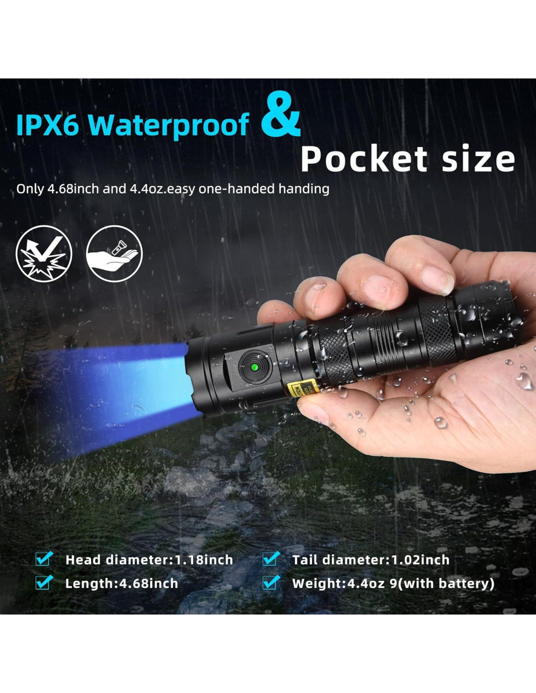 - [Linterna a Prueba de Agua IPX4 & Vida Conveniente] Linterna a prueba de agua IPX4 viene con sellos de goma engrosados para asegurar que no se cortocircuite en ambientes húmedos. No teme a la lluvia o la nieve. Puerto de carga oculto, la luz indicadora de energía en el interruptor lateral se volverá roja, para recordarle que recargue a tiempo cuando la energía sea insuficiente. Evita inconvenientes innecesarios causados por el apagado sin batería.
