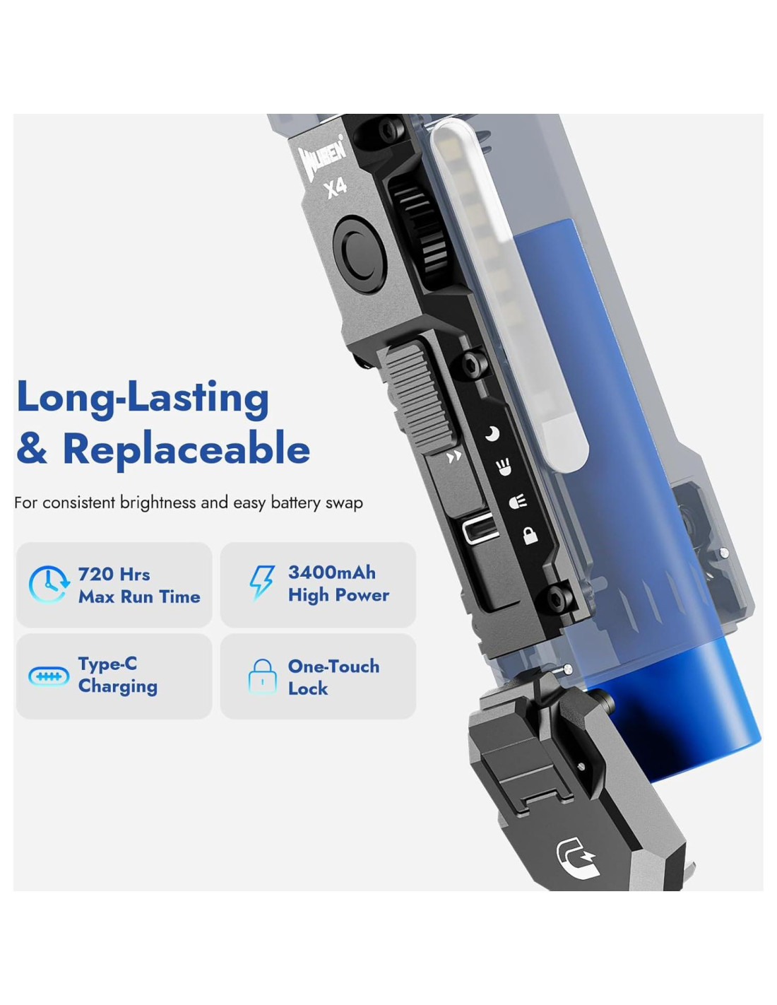 - Larga Vida de Batería e Indicador de Batería: La pequeña linterna X4 tiene una vida útil de batería de hasta 285 horas, y su batería de alta capacidad de 3350mAh se puede cargar completamente en solo 2.5 horas. También cuenta con una función de indicador de batería, que te permite monitorear el nivel de batería en cualquier momento.