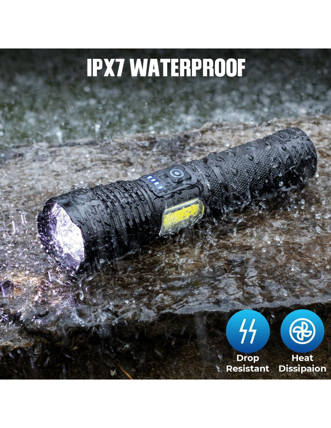 - 5000 mAh Y GRAN CAPACIDAD - Una linterna fuerte recargable incluye una BATERÍA RECHARGABLE premium de 5000 mAh, capaz de funcionar continuamente durante 15 horas, es esencial para la iluminación al aire libre.