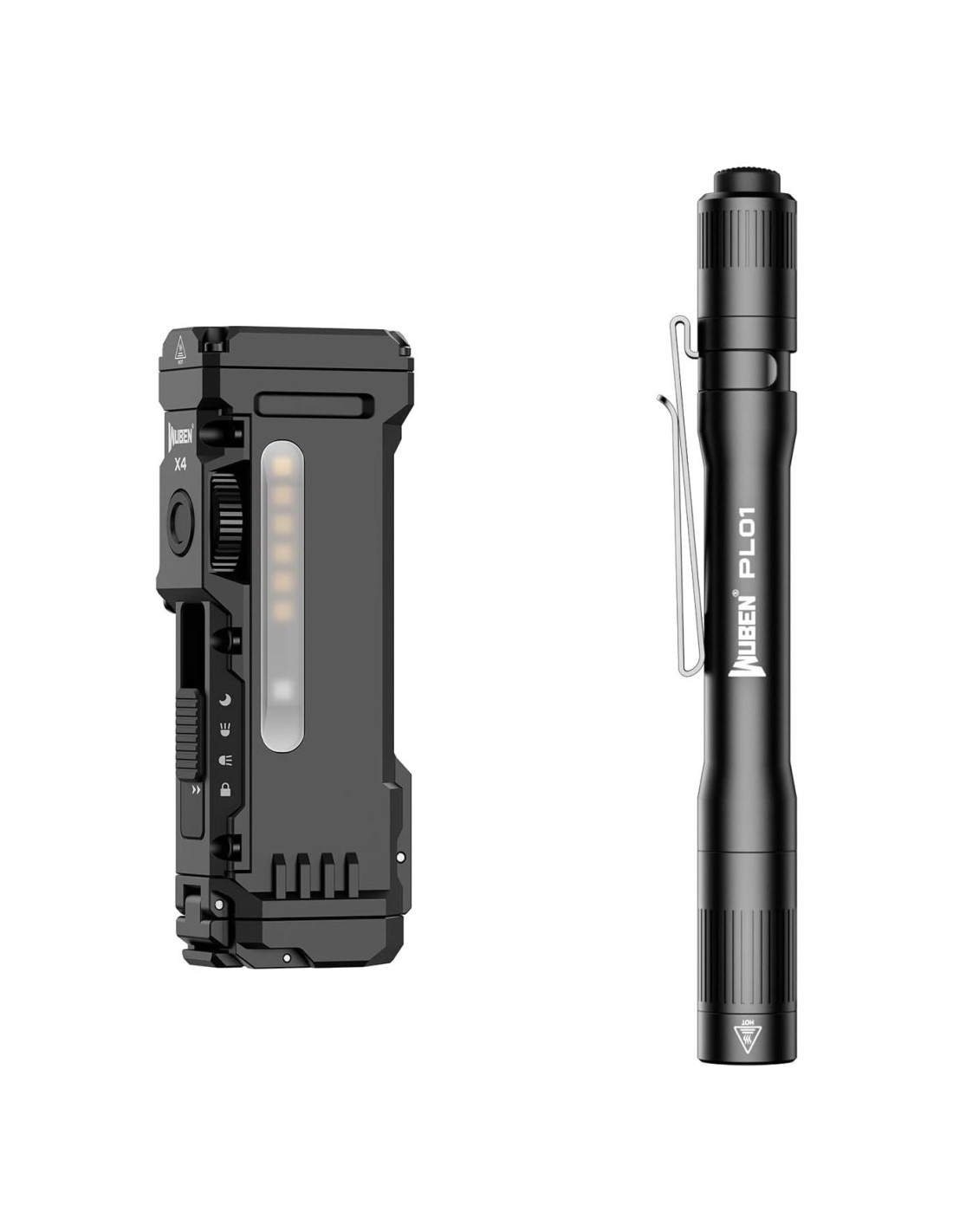 - WUBEN X4 Linterna portátil multifuncional: La pequeña linterna WUBEN X4 presenta un diseño de fuente de luz dual, con la luz principal proporcionando hasta 1500 lúmenes de brillo y una distancia de haz de hasta 205 metros. La luz lateral proporciona luz cálida con hasta 1 a 100 lúmenes y tiene una fuente de luz RGB.
