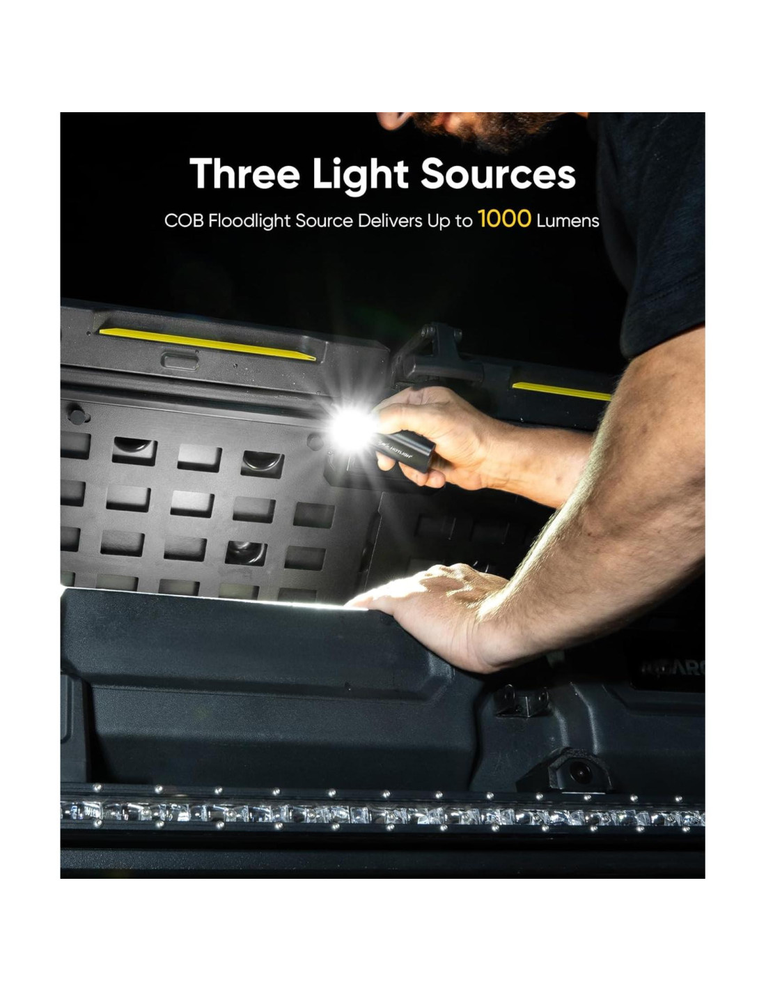 - Iluminación ultra-brillante de área amplia - La linterna plana cuenta con un sistema de triple luz (faro COB + foco LED + luz roja), con su faro COB ofreciendo brillo de doble modo (5500K-7500K), asegura una representación precisa del color. La salida máxima de 1000 lúmenes proporciona una iluminación potente.