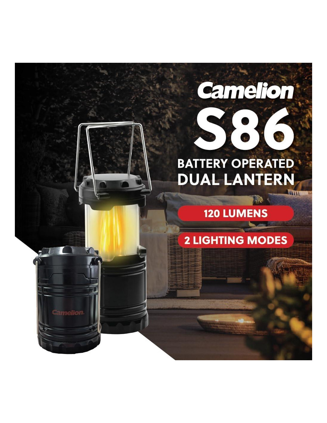 Linterna Doble Camelion S86 La Linterna LED Doble Modo Camelion S86 tiene dos configuraciones de luz: una luz blanca brillante para iluminar un área grande y una luz de llama para replicar una antorcha. Simplemente levante la parte superior de la linterna para cambiar de un modo de iluminación a otro. Las asas de metal se pueden usar para llevar la linterna o colgarla para un uso manos libres. Este producto es ideal para actividades al aire libre como camping, pesca, senderismo y preparación para emergencias. Es un gran regalo para cualquier ocasión. Características: 2 configuraciones de luz - luz LED blanca brillante y luz de efecto llama Interruptor de tirón - tire hacia arriba la parte superior para cambiar la configuración de luz Larga vida útil - luz LED eficiente en energía Económico - utiliza baterías AA ampliamente disponibles (incluidas) Asas de metal de uso dual - llévela a donde quiera, cuélguela donde desee Especificaciones IPX4: Requiere 3 baterías AA (incluidas) Modos de luz: Luz blanca, Efecto llama Tiempo de funcionamiento: Luz blanca: 10 horas, Efecto llama: 24 horas Brillo: Luz blanca: 120 lúmenes, Efecto llama: 30 lúmenes Dimensiones del artículo: 4.9 pulgadas (12,45 cm) x 3.19 pulgadas (8,10 cm) x 3.4 pulgadas (8,64 cm) Dimensiones del display: 12.25 pulgadas (31,12 cm) x 9 pulgadas (22,86 cm) x 8.5 pulgadas (21,59 cm) (An x Al x Prof) Peso del artículo: 0.57 lbs (0,26 kg)
