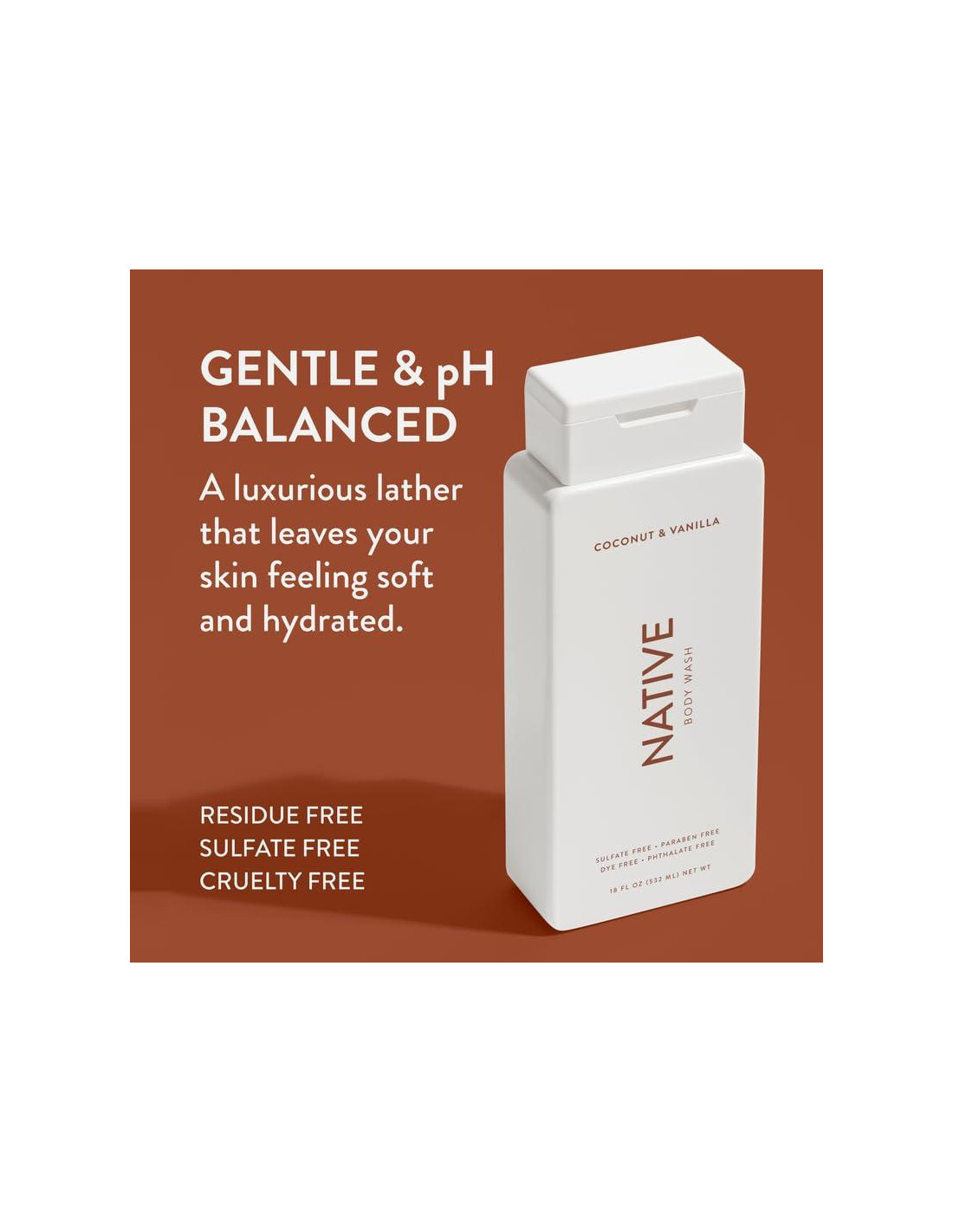 - Ingredientes Limpios - El gel de ducha nativo contiene ingredientes derivados naturalmente. También utilizamos fragancias sintéticas seguras, sostenibles (libres de ftalatos) y fragancias naturales.