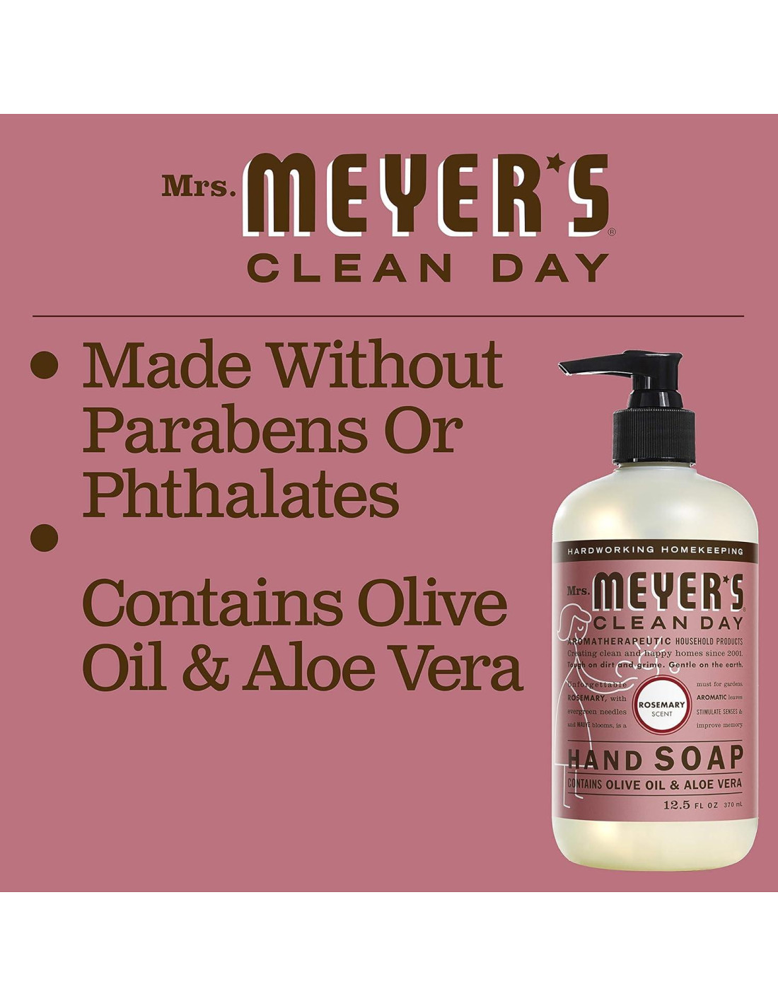 Los jabones de manos Mrs. Meyer's Clean Day están específicamente hechos para limpiar y refrescar las manos sin secarlas, mientras proporcionan un aroma especial y singular para todo tu hogar. Disfruta del aroma memorable y robusto de nuestro jabón de manos de Romero con hojas de pino limpias y frescas y flores malvas sonrojadas. Esta fórmula de jabón de manos trabajadora contiene aceite de oliva, aloe vera y aceites esenciales, que limpian y refrescan las manos. Estos ingredientes cuidadosamente seleccionados crean un jabón que no seca pero suaviza las manos ocupadas. Hecho sin parabenos, ftalatos, ingredientes de origen animal y siempre un jabón libre de crueldad. También disponible en otros aromas y productos inspirados en el jardín, como lociones corporales, detergentes para ropa, velas y mucho más. Mrs. Meyer's - arraigado en la bondad.