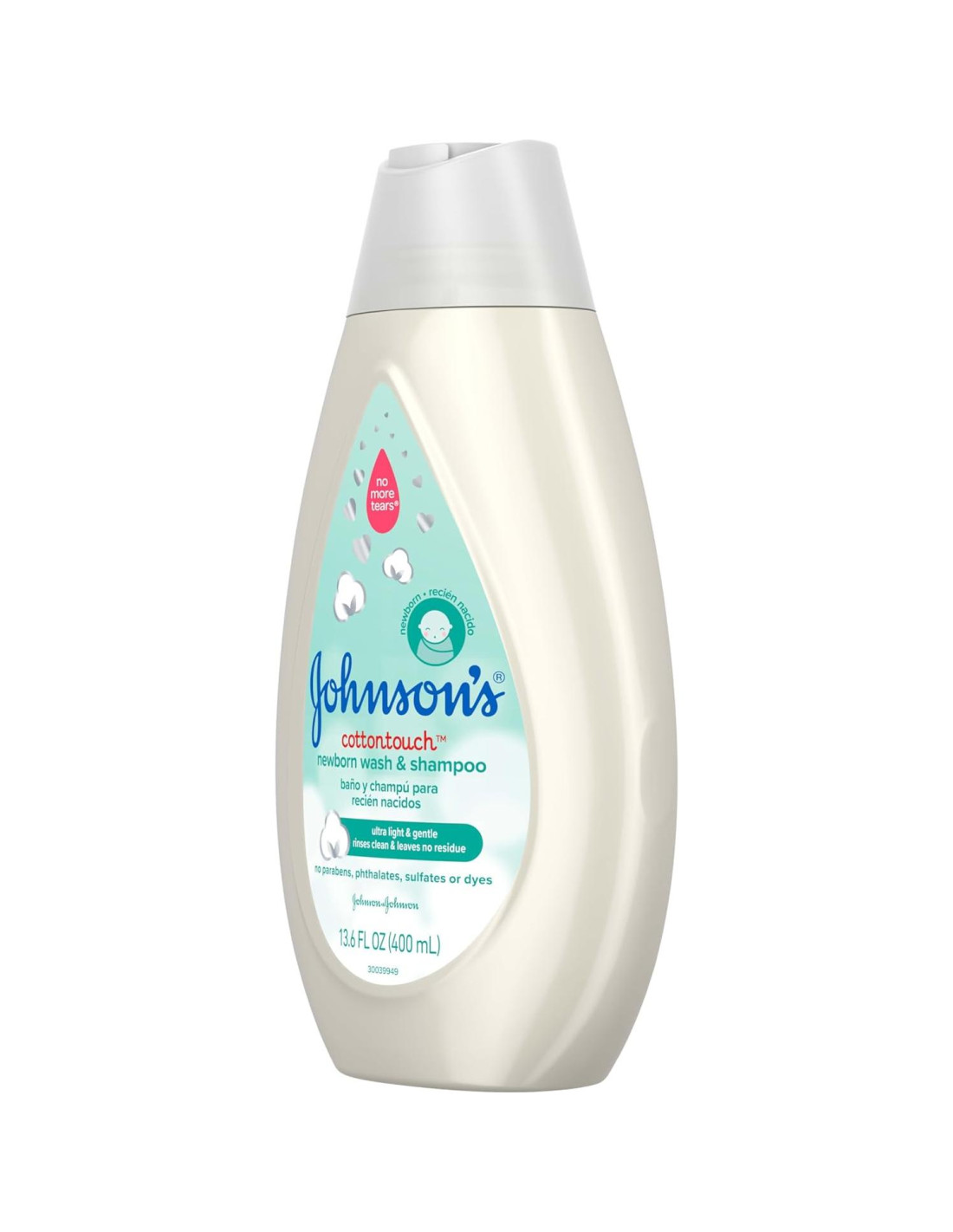 - Botella de 403.6 ml de jabón y champú para bebés recién nacidos CottonTouch de Johnson con algodón real y tecnología No More Tears diseñada para la piel sensible de tu bebé recién nacido